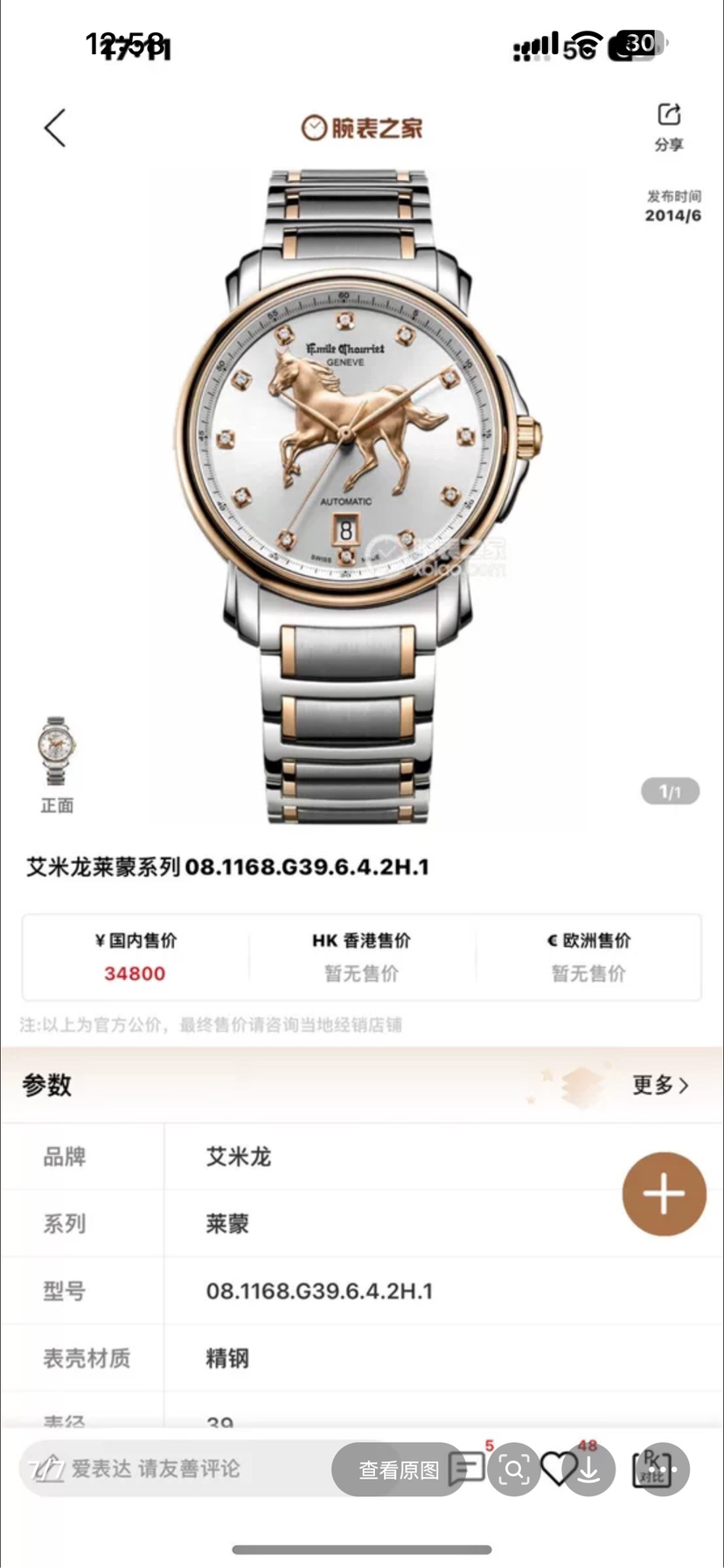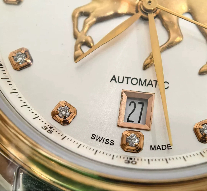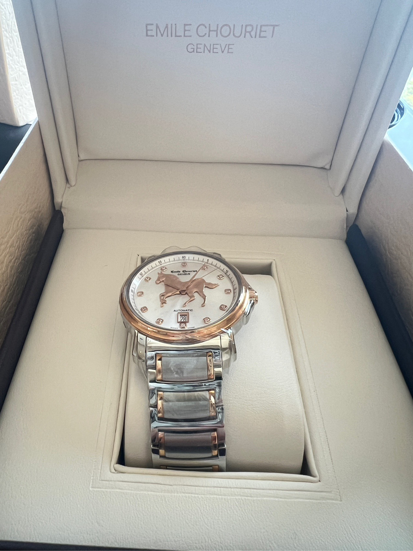 全新全套25年艾米龙莱蒙系列08.1168.G39.6.4.2H.1表圈表盘金色部分18k金,表带包金,钻石刻度,龙马精神步步高,限量款带编号,表头39mm。全自动机芯。带票25年全新全套,送长辈,送领导必备,吊牌在,价格3万多,现货好价