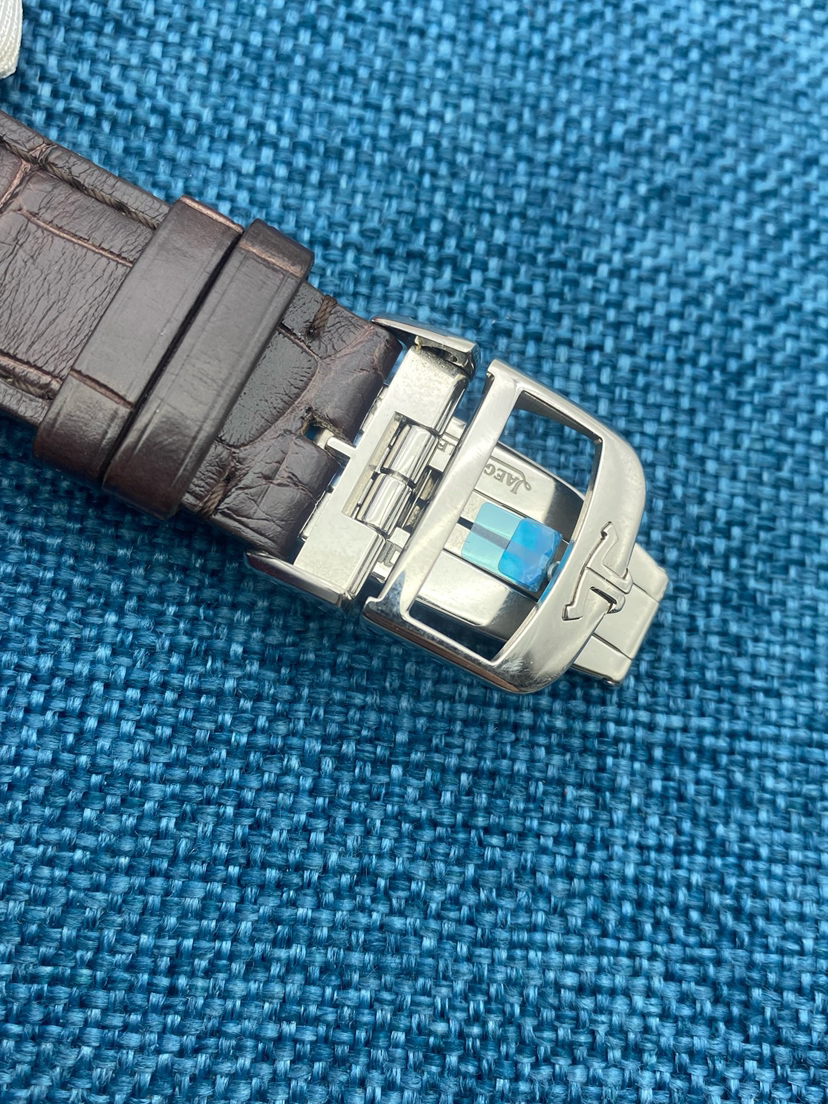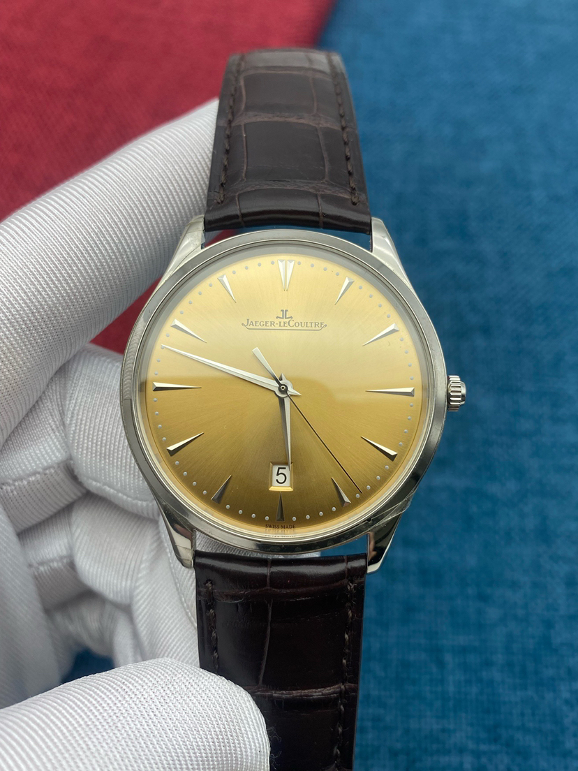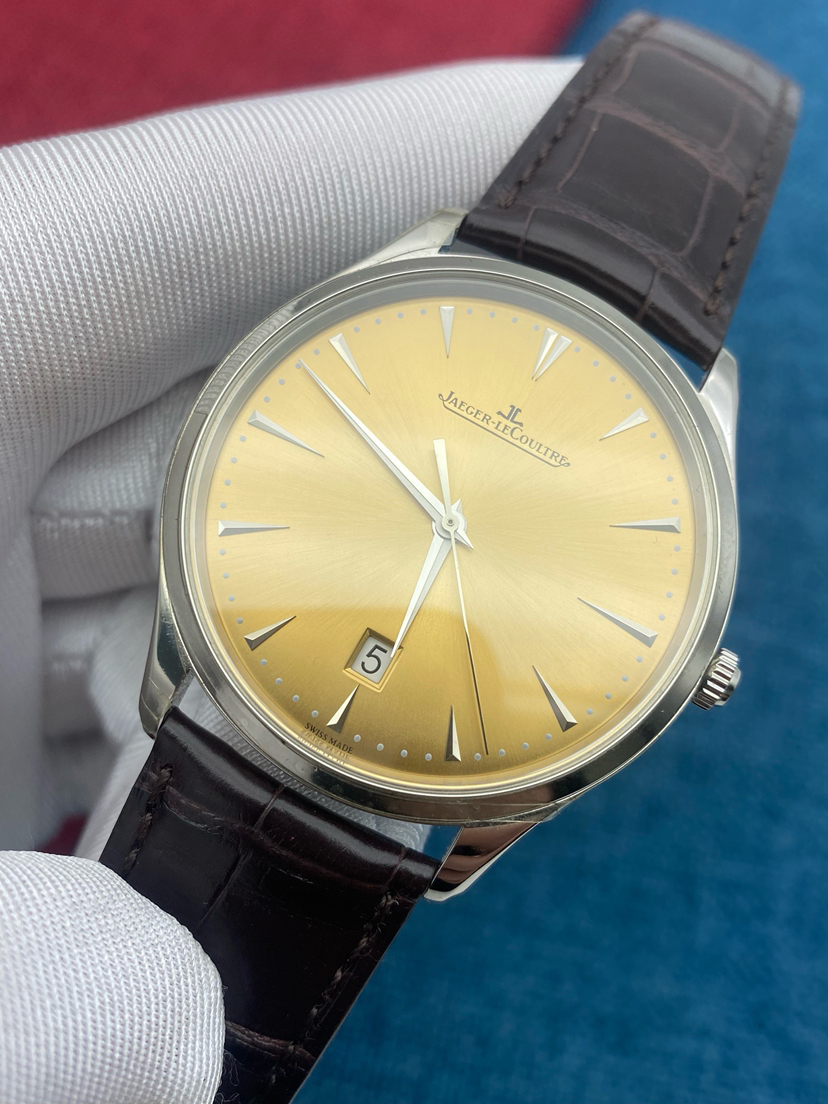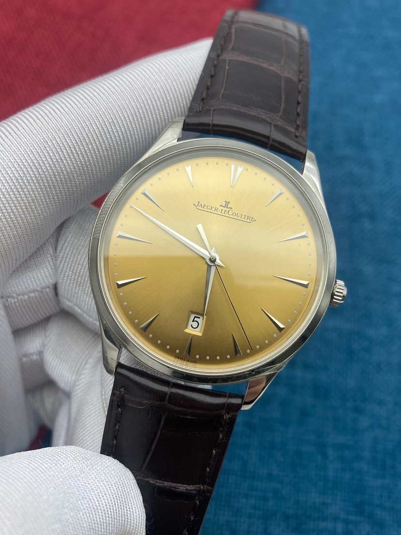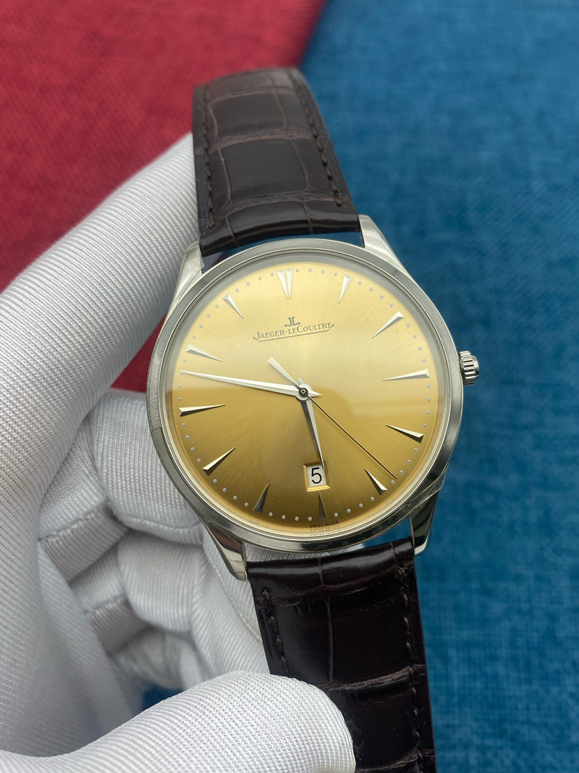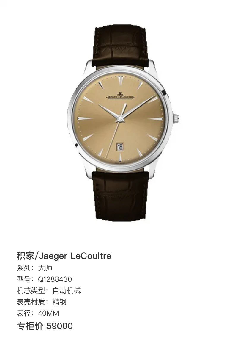 积家/Jaeger LeCoultre 大师系列Q1288430,稀有三文鱼表盘,自动机械男士腕表,精钢材质,表径40MM,专柜价59000,极品试戴成色,部分膜在,现好价