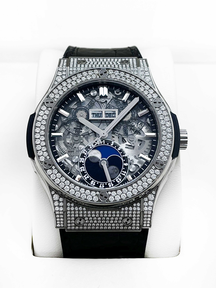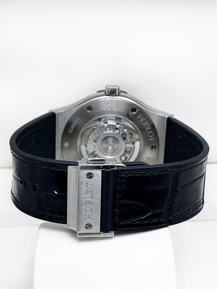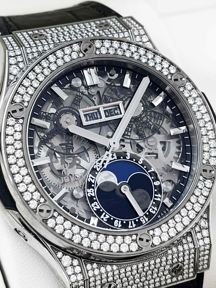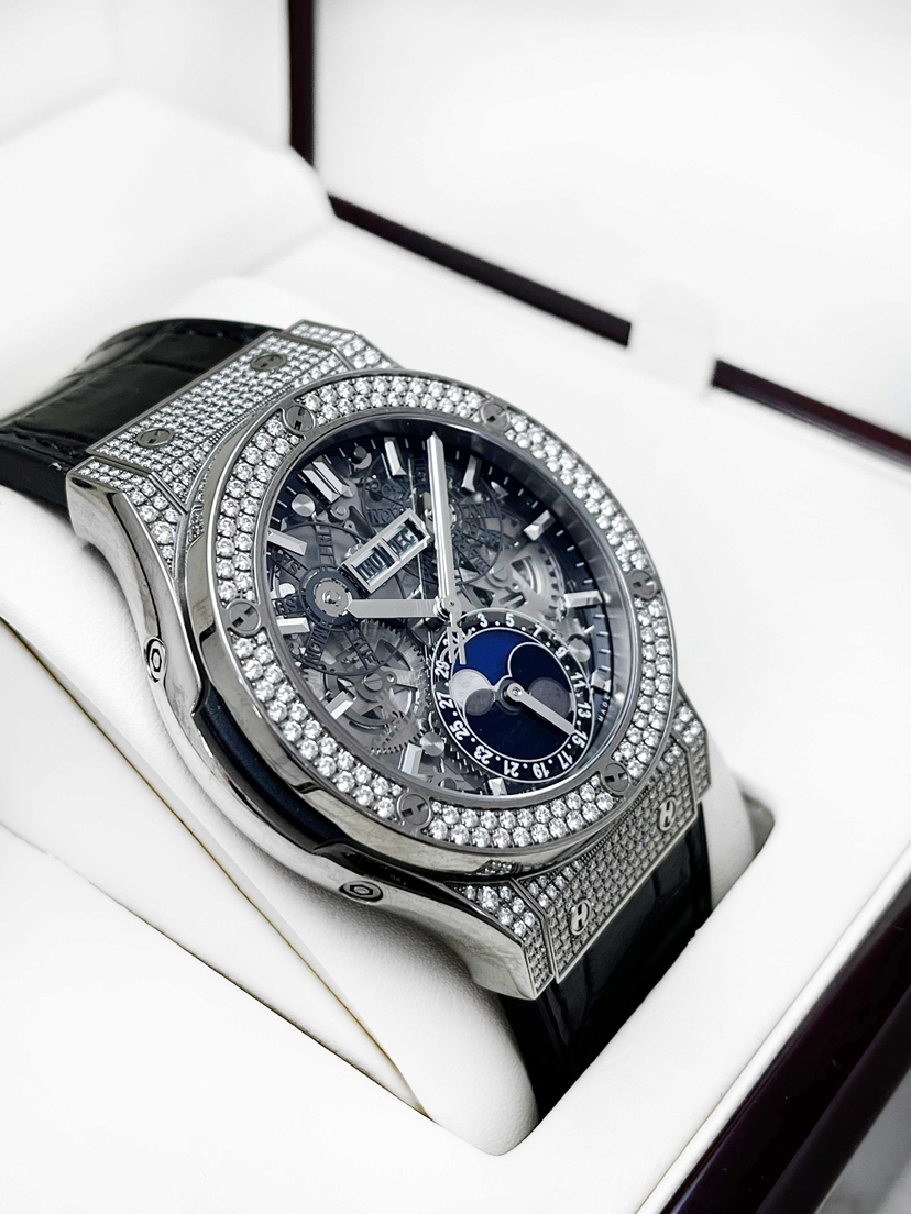 宇舶经典融合系列517.NX.0170.LR.1704自动机械男款,新单表,42mm表径,钛金属表壳,橡胶/鳄鱼皮表带,日期、星期、月份、月相功能,公价:24.37万。