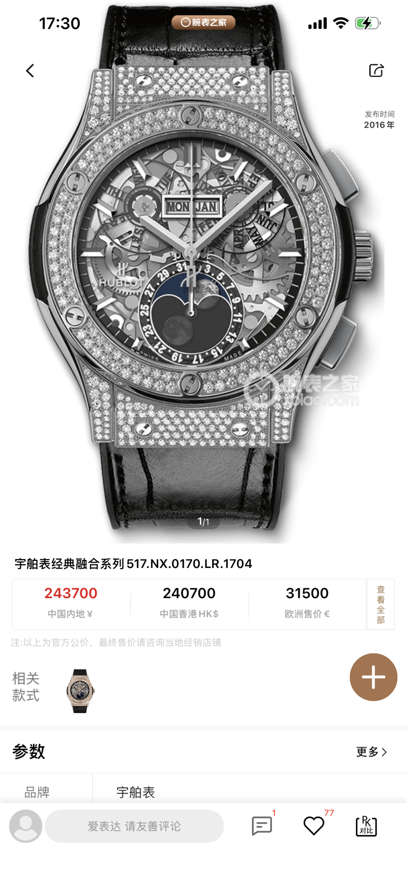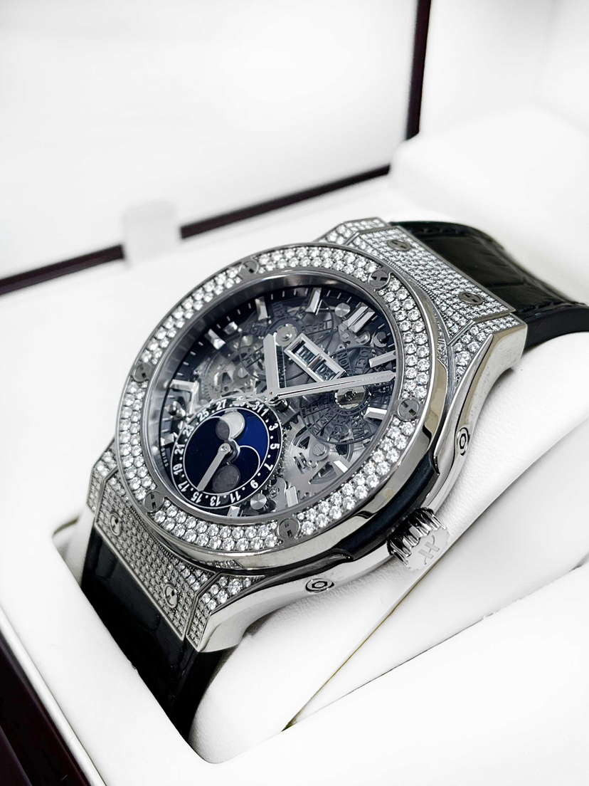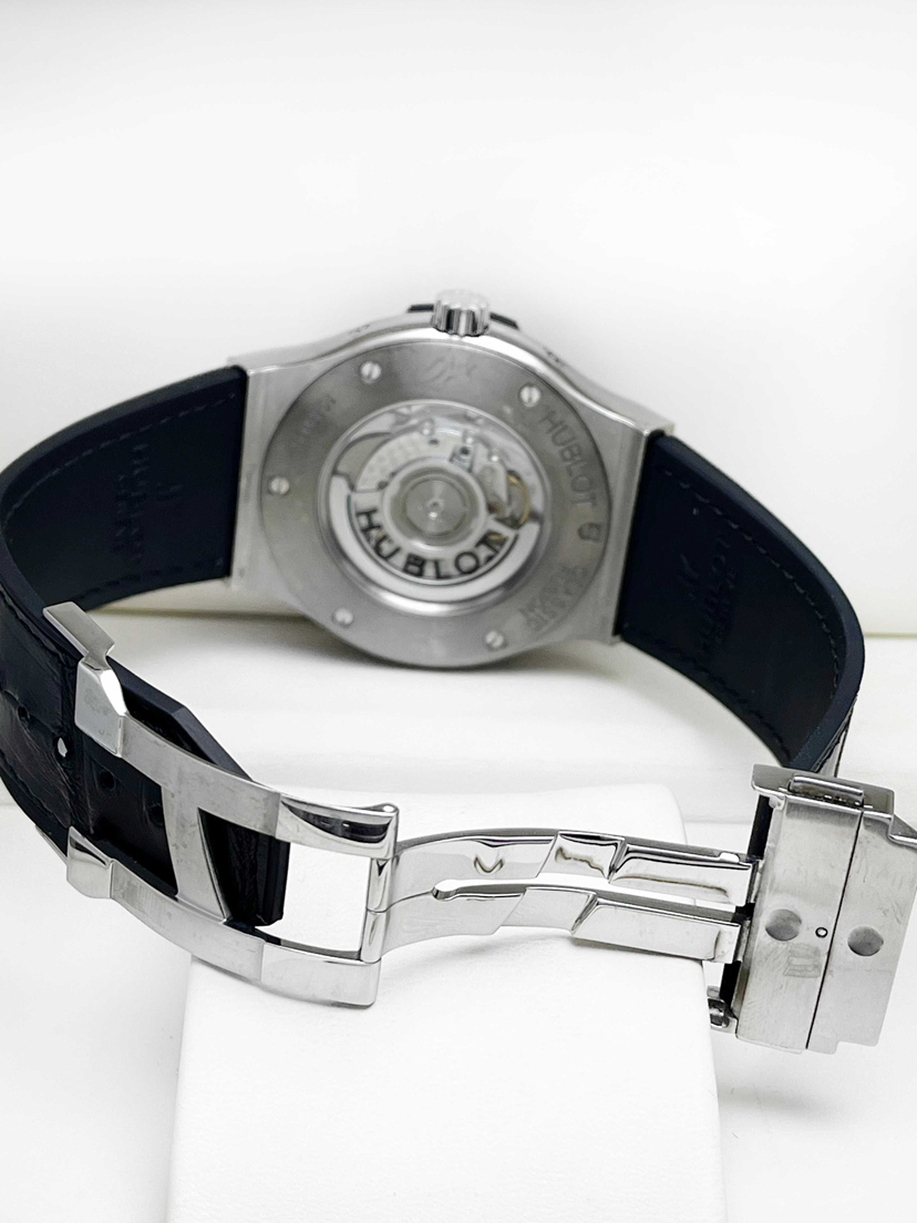 宇舶经典融合系列517.NX.0170.LR.1704自动机械男款,新单表,42mm表径,钛金属表壳,橡胶/鳄鱼皮表带,日期、星期、月份、月相功能,公价:24.37万。