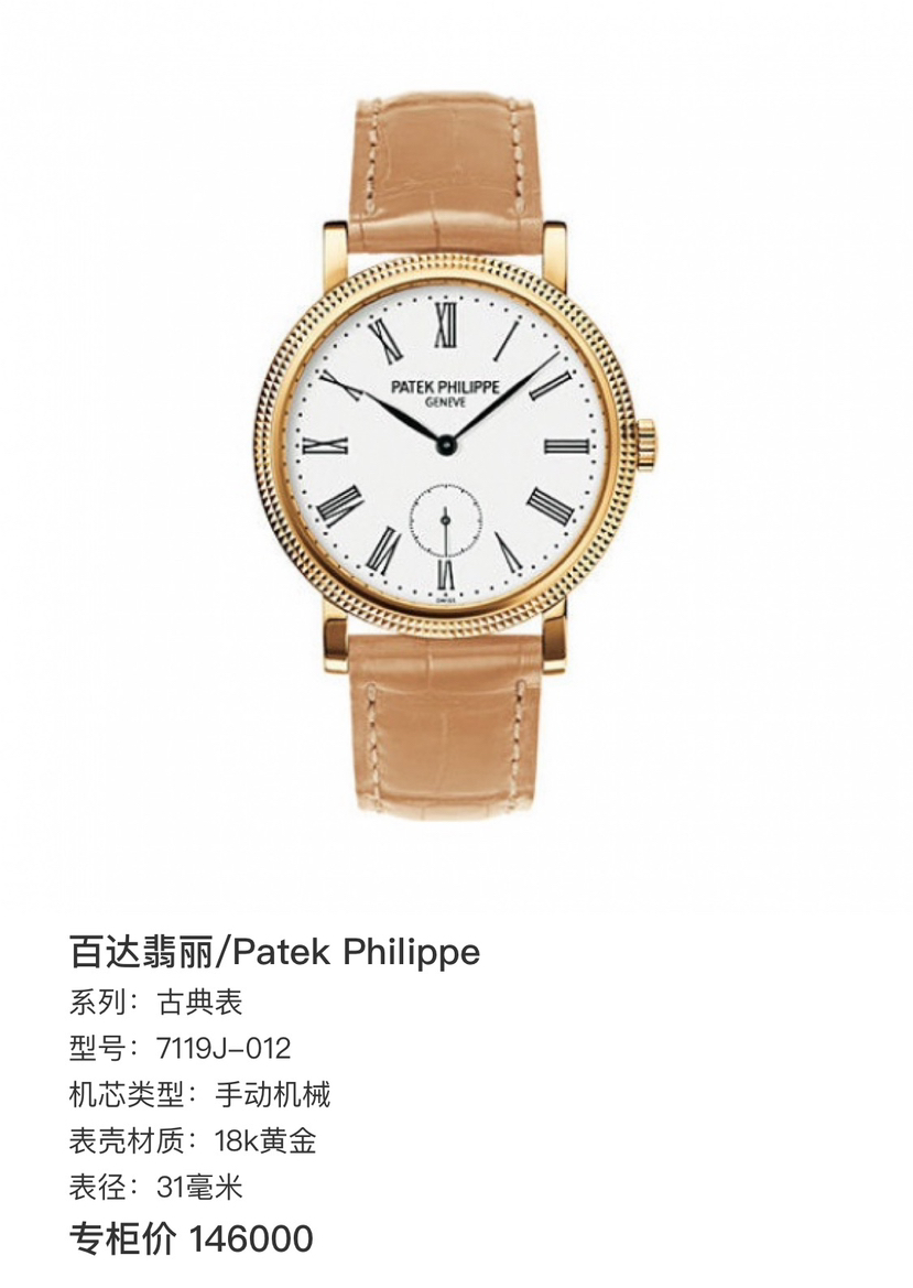 百达翡丽/Patek Philippe 古典表 7119J-012 手动机械 18k黄金 31毫米 附件:单表 专柜价146000
