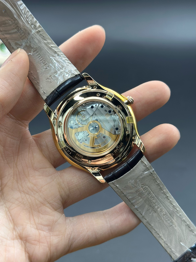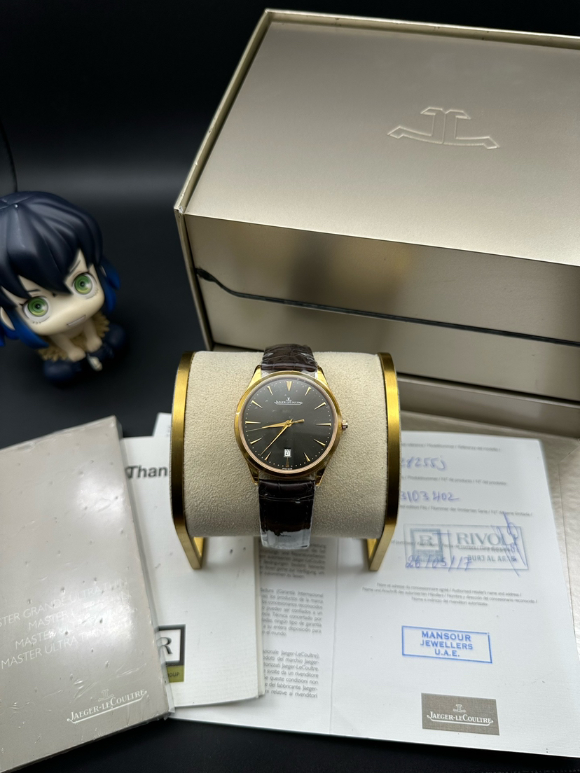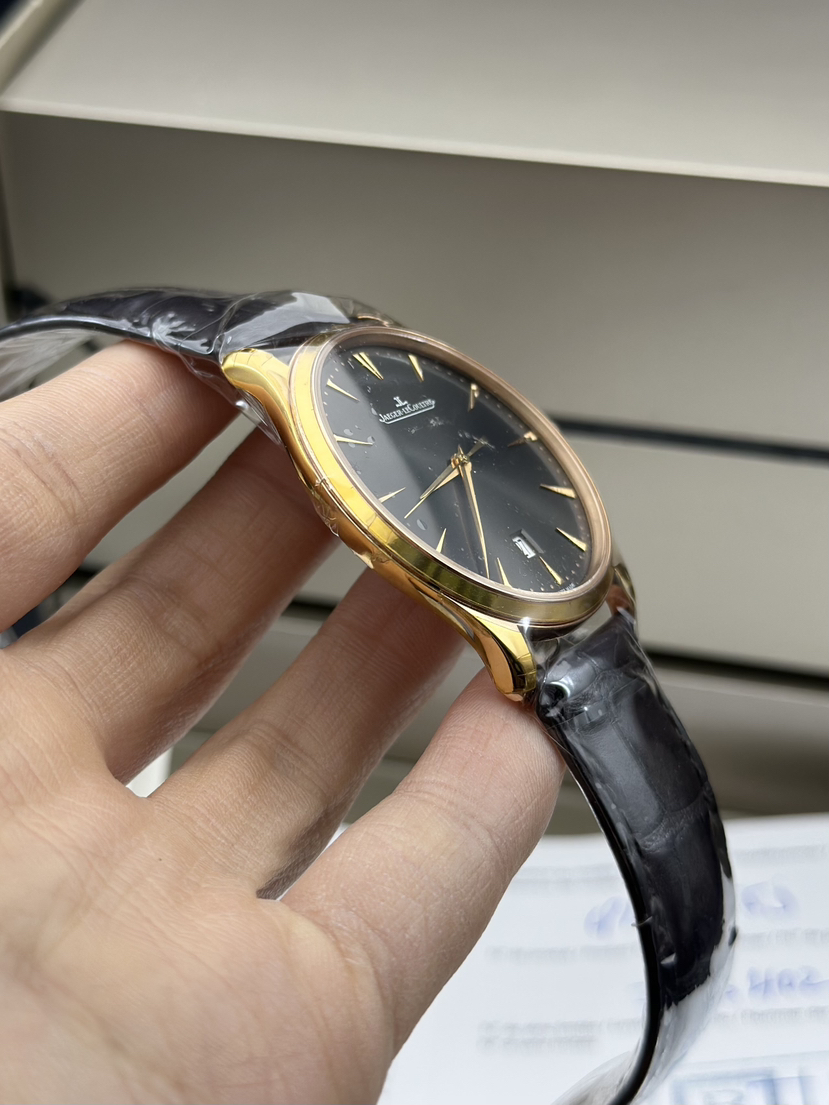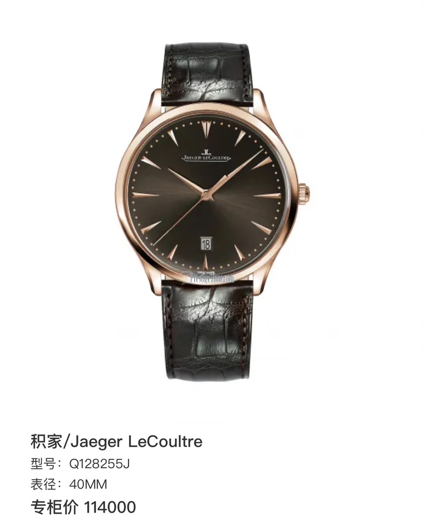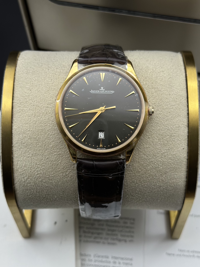 库存全新未使用品!积家 大师 Q128255J超薄男士手表,40表盘,咖啡盘面,放射状拉丝,太妃形大三针 带日历 新款扣,新款金陀!简单大气!2017年全新全套未使用品!参考公价115000,现货特价