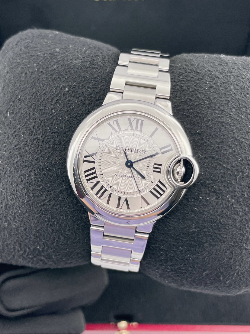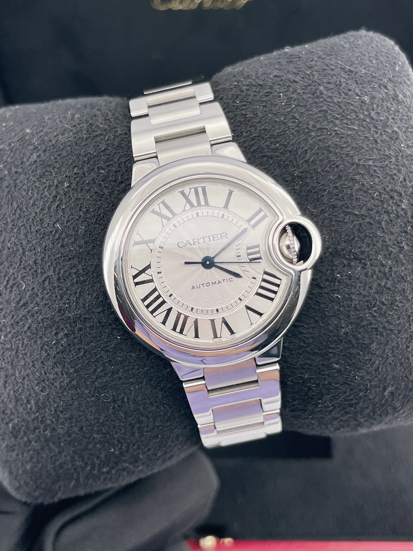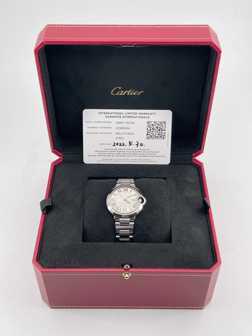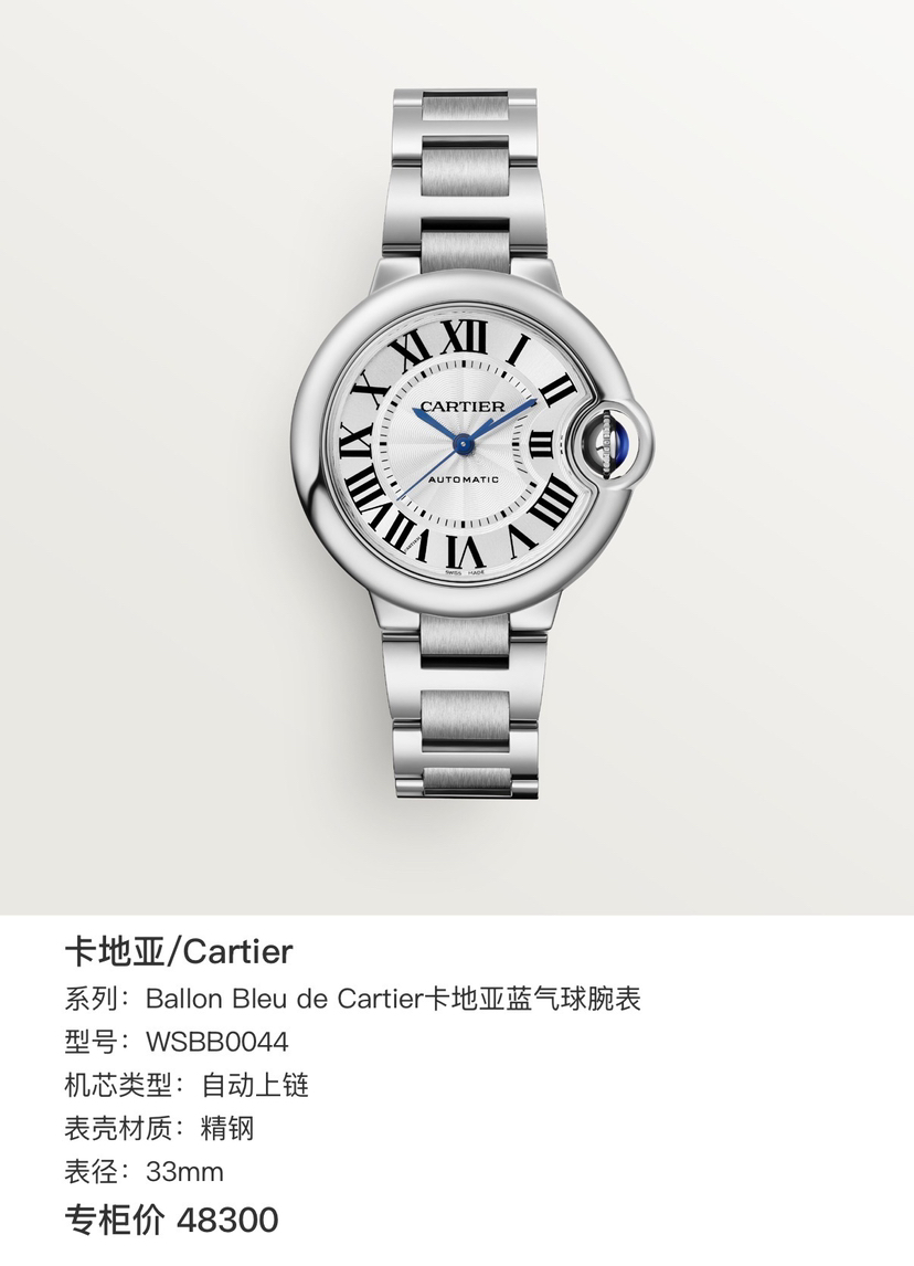 卡地亚 Ballon Bleu de Cartier 蓝气球腕表 WSBB0044 自动上链 精钢 33mm表径 22年全套 专柜价48300 现好价。