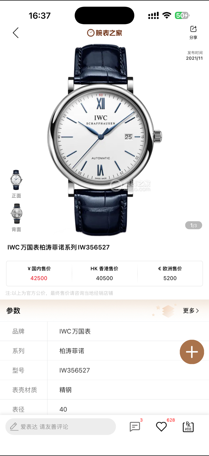 IWC/万国表 柏涛菲诺系列 IW356527 自动机械,40毫米,男士精钢腕表,专柜价:¥41300。25年10月份,全新未使用品,送礼自用非常划算,现货好价!