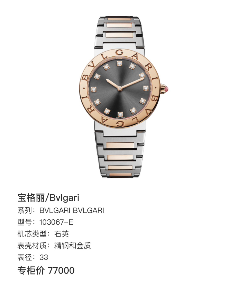 宝格丽 BVLGARI BVLGARI 103067-E 石英 精钢和金质 33mm表径 专柜价77000 单表好价。