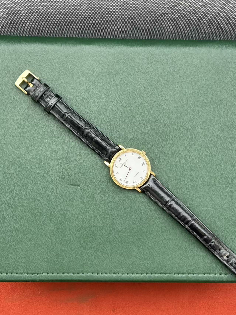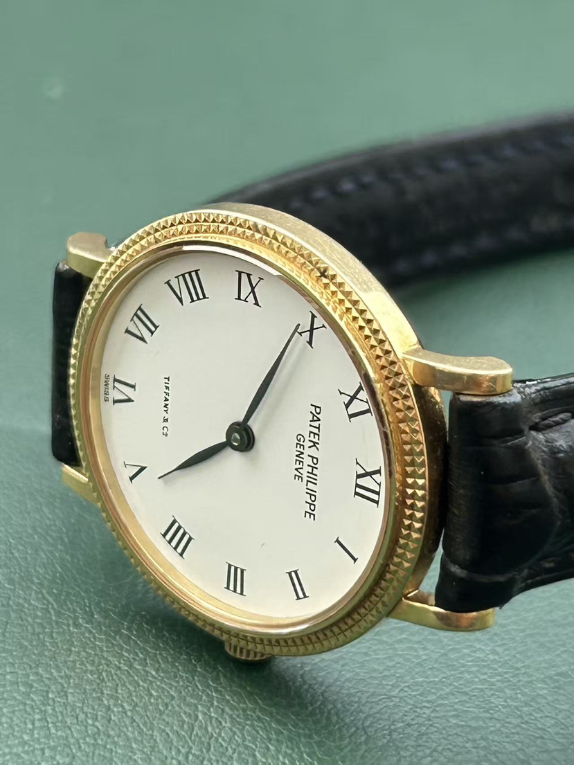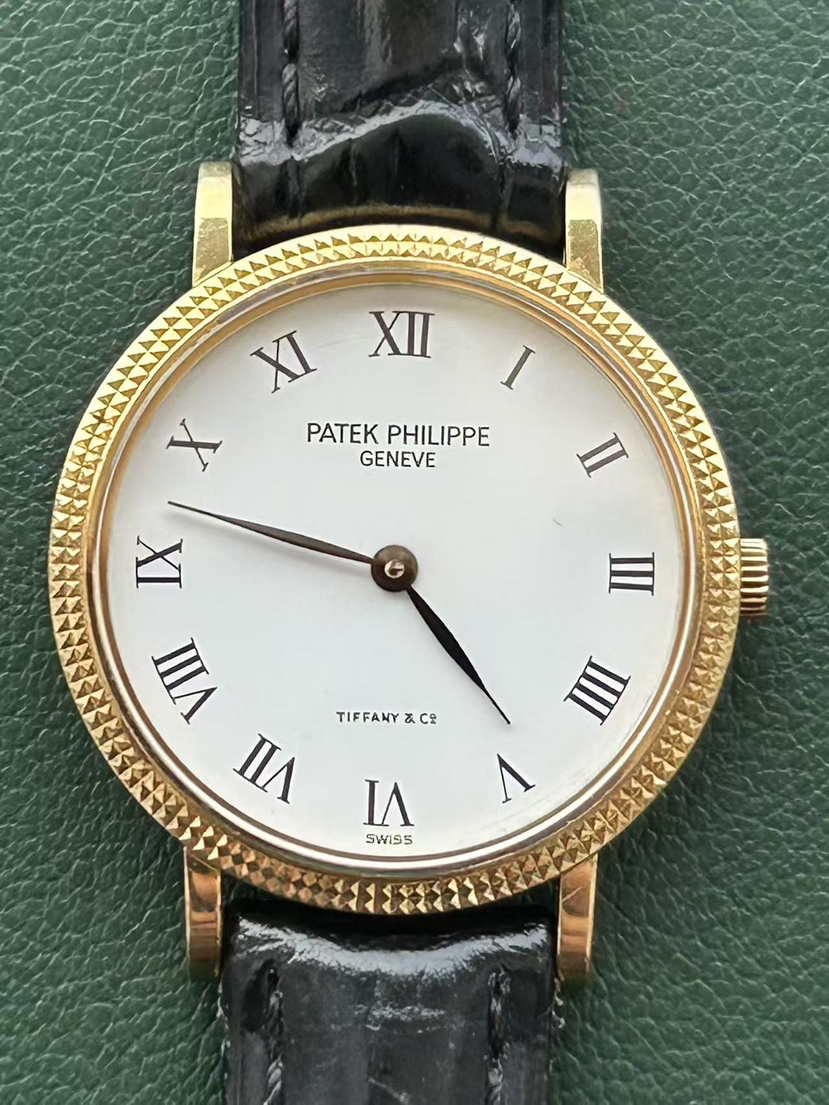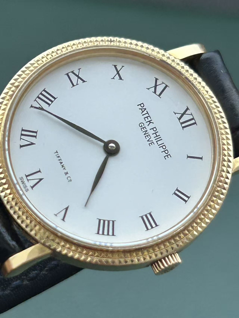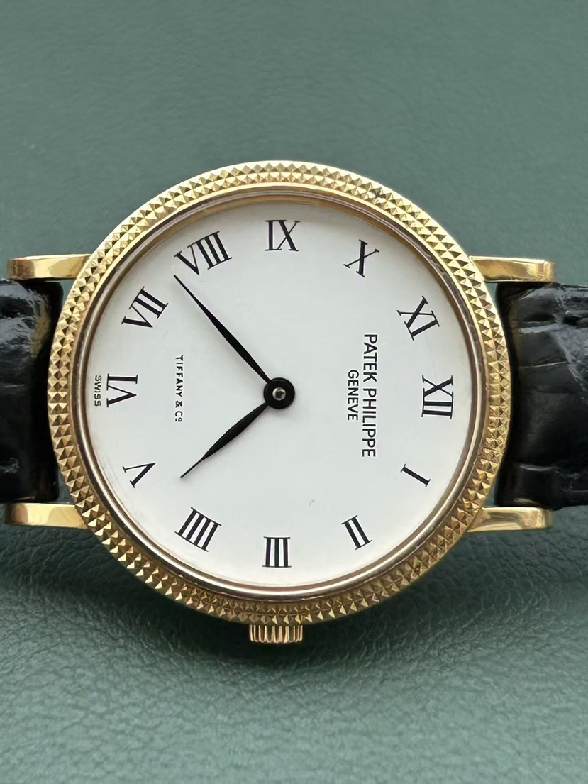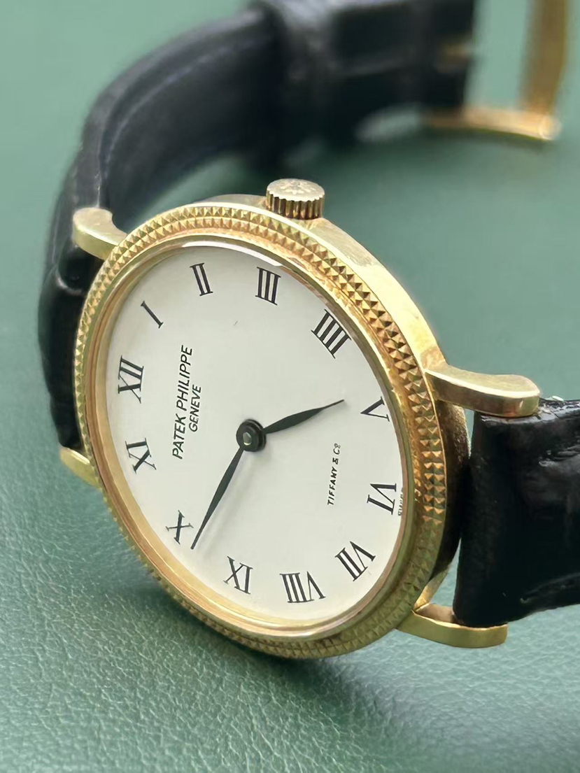 百达翡丽卡拉特拉瓦系列4809J-001女士手动机械表,18k黄金材质,白盘罗马刻,25mm表径,巴黎钉圈,原始成色好品,罕见的蒂芙尼联名款。小巧精致,性价比拉满
