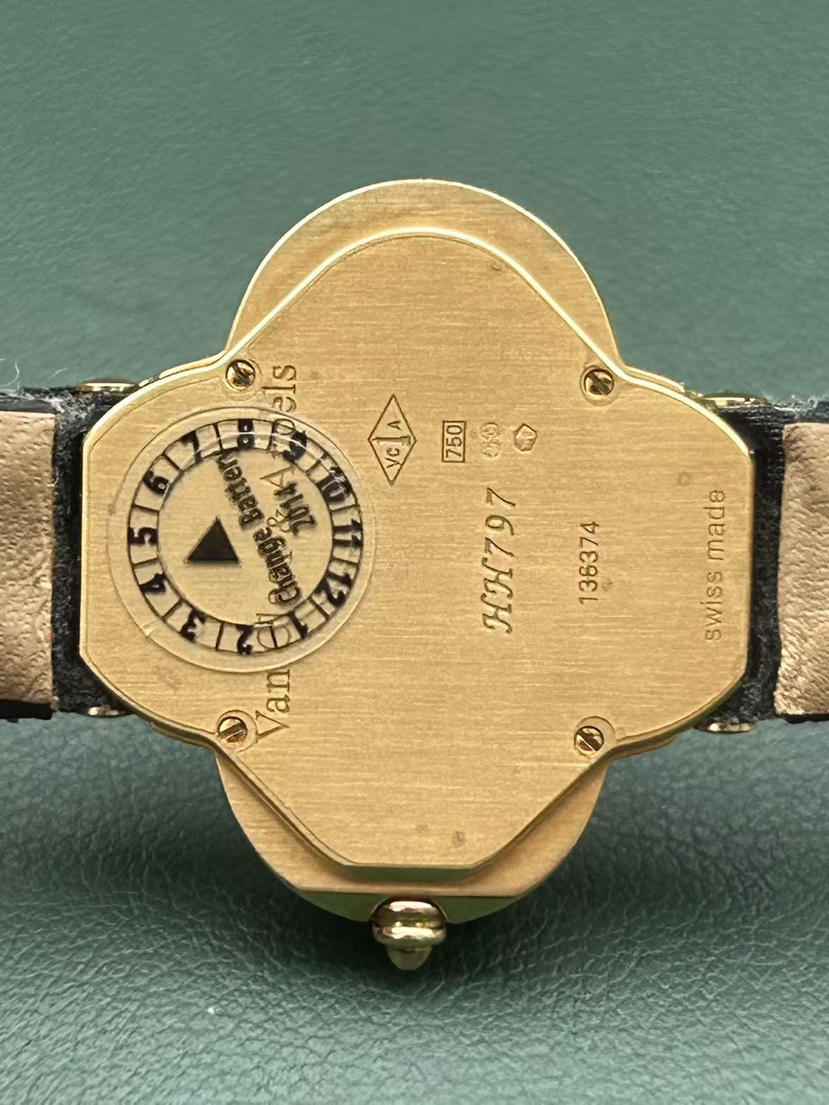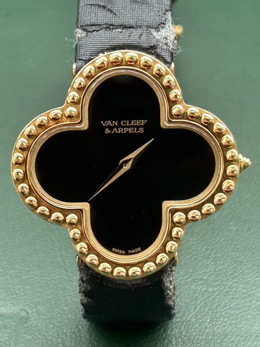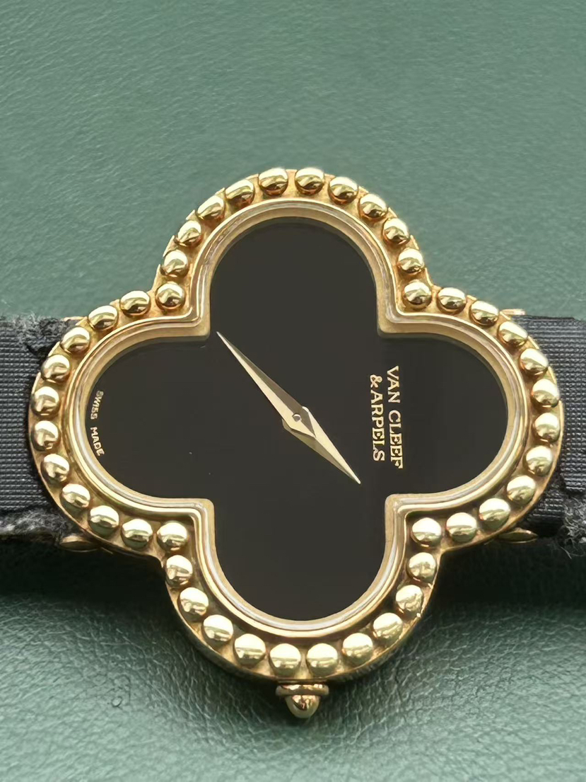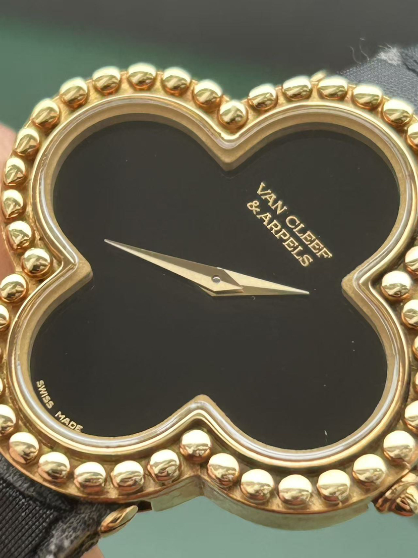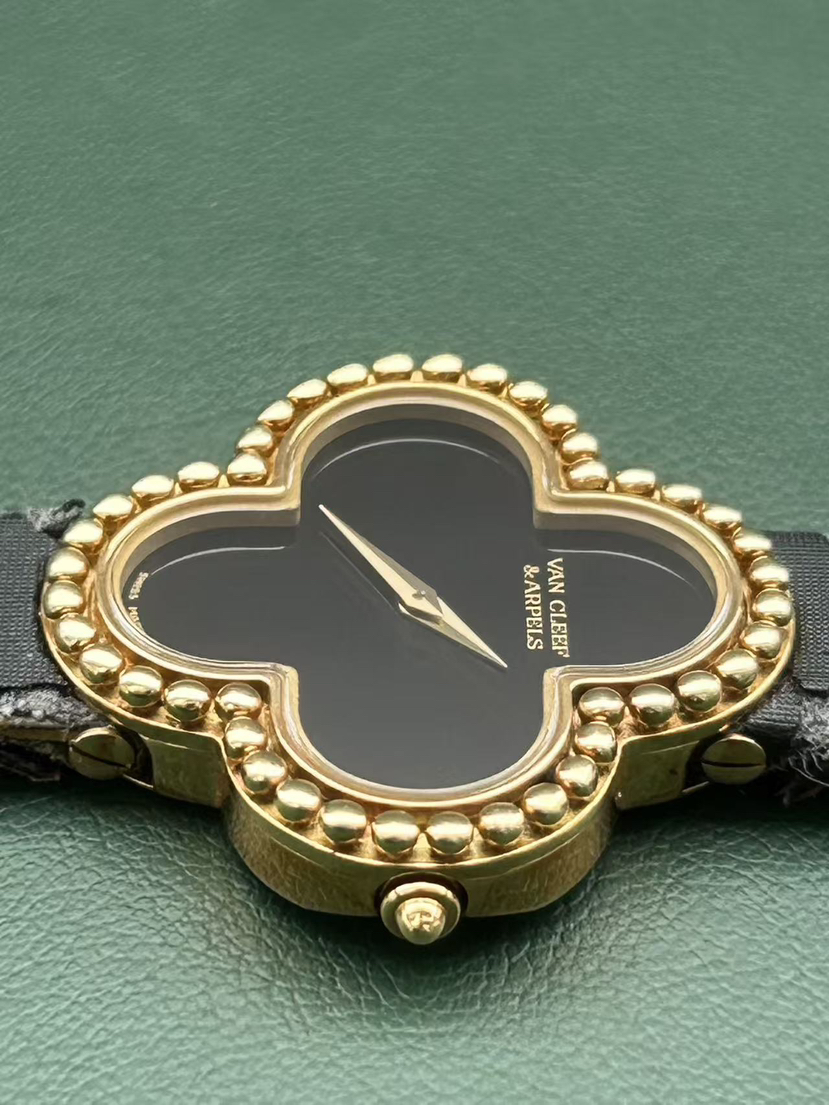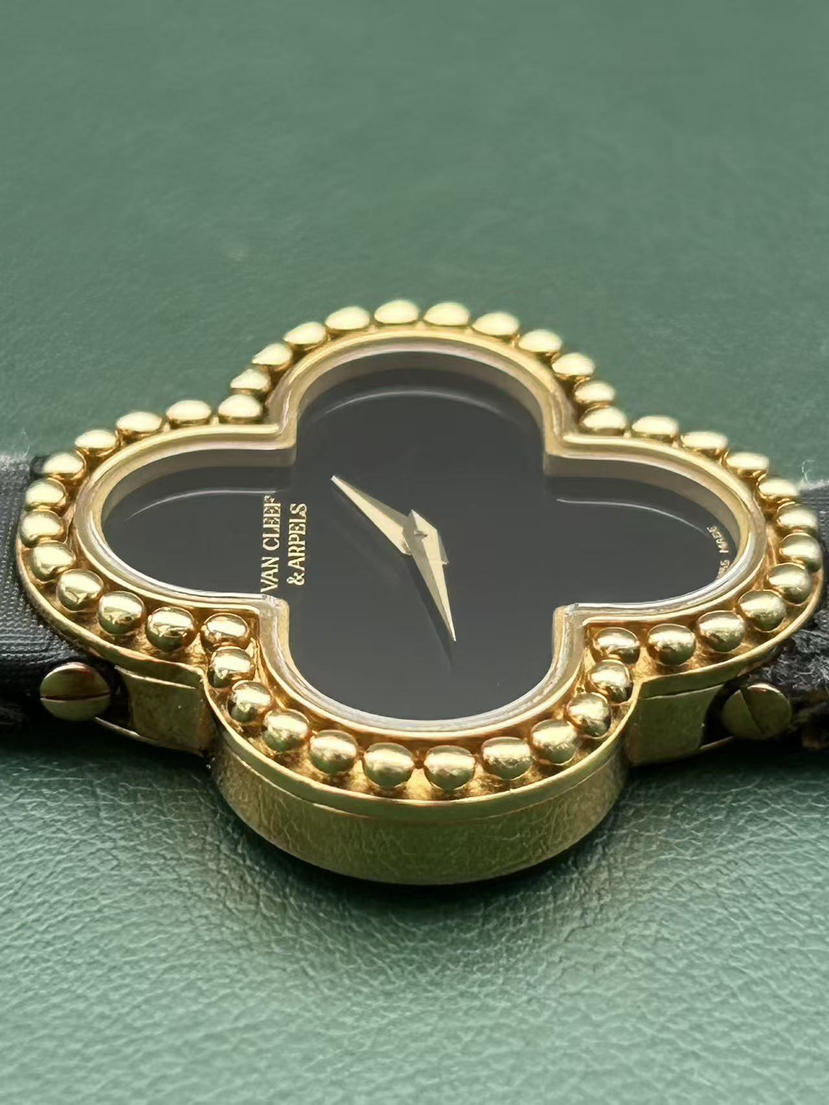 梵克雅宝ALHAMBRA系列VCARD21700女士石英腕表,经典四叶草造型,29.3mm表径,18k黄金材质,原始成色,黑玛瑙盘,两针,巴黎钉外圈,公价9万左右