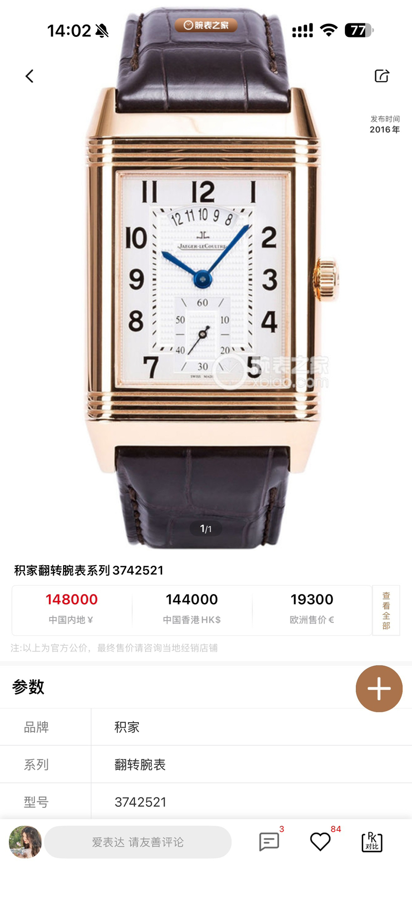 积家 翻转腕表系列 3742521 手动机械 18k玫瑰金材质 48.4mmX29.2mm 全套附件 专柜售价148000 现货好价