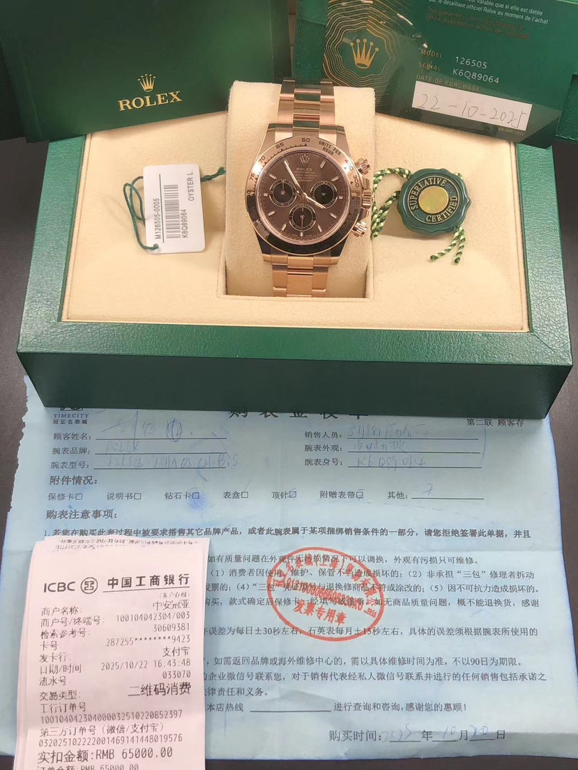 25年10月,劳力士型号m126505-0005(咖啡盘)极品成色,全套全长,带票据!