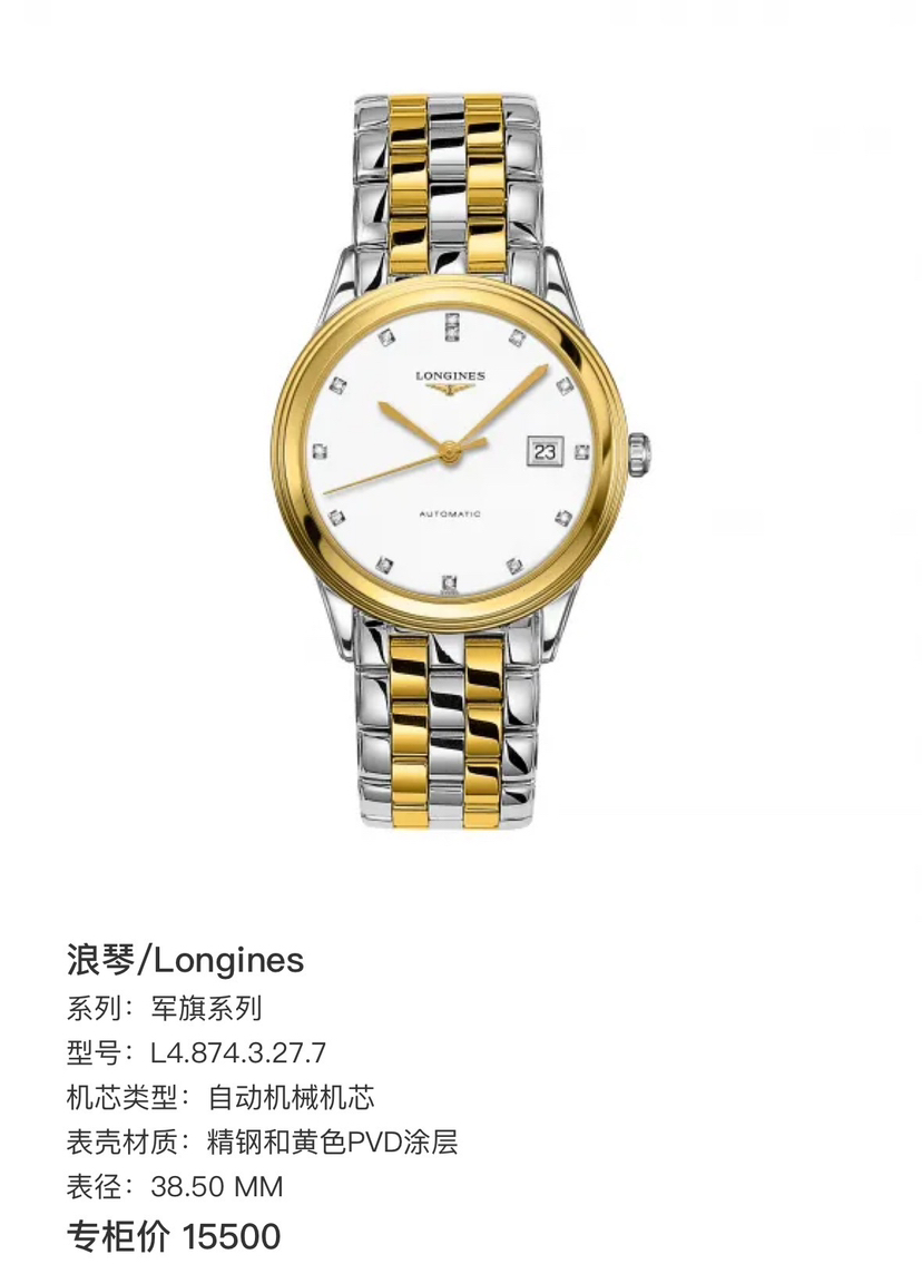 浪琴 军旗系列 L4.874.3.27.7 自动机械机芯 精钢和黄色PVD涂层 38.5mm表径 专柜价15500 重新镀好 单表好价。