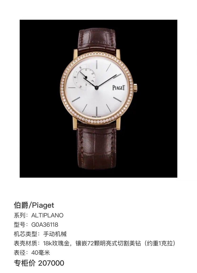 伯爵/Piaget ALTIPLANO G0A36118 手动机械 18k玫瑰金,镶嵌72颗明亮式切割美钻(约重1克拉) 40毫米 专柜价207000 17年保卡