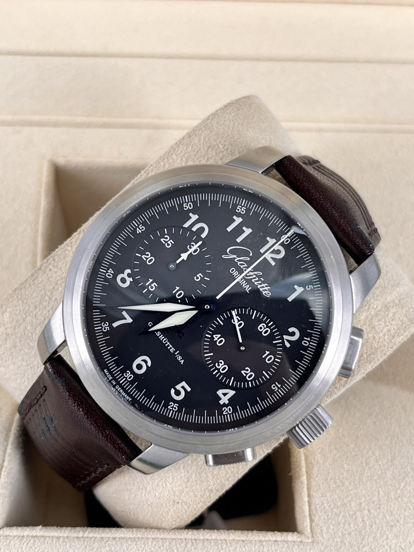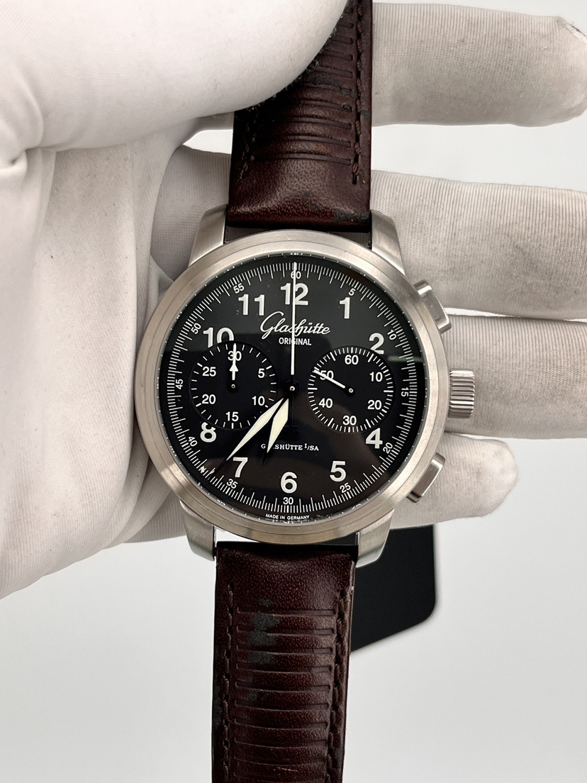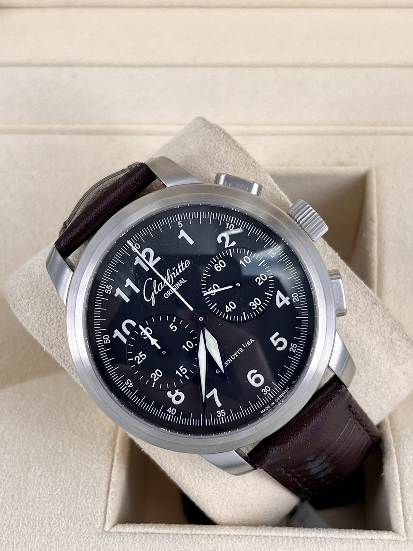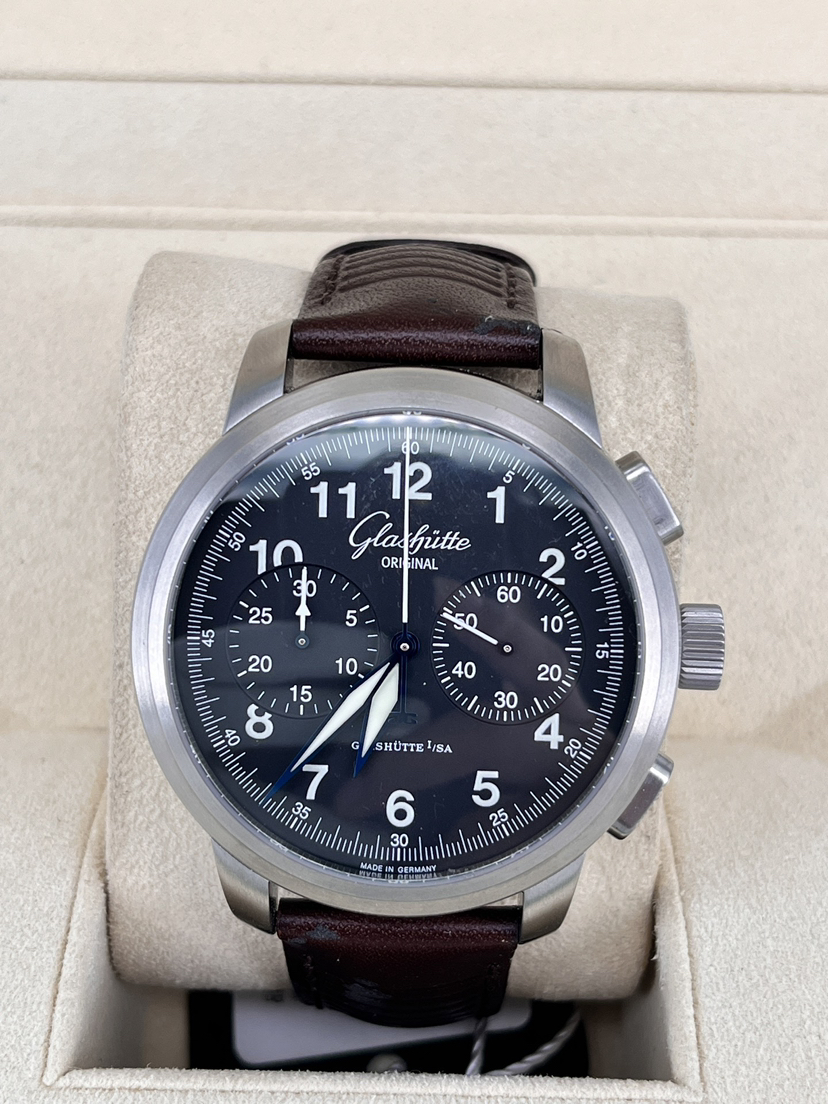 格拉苏蒂原创飞行员系列腕表,整表由精钢打造,表面做磨砂处理,44mm表径,黑色双眼计时表盘,阿拉伯数字时标清晰易读,蓝色指针,白色计时大秒针,搭载背透39-31自动机械机芯