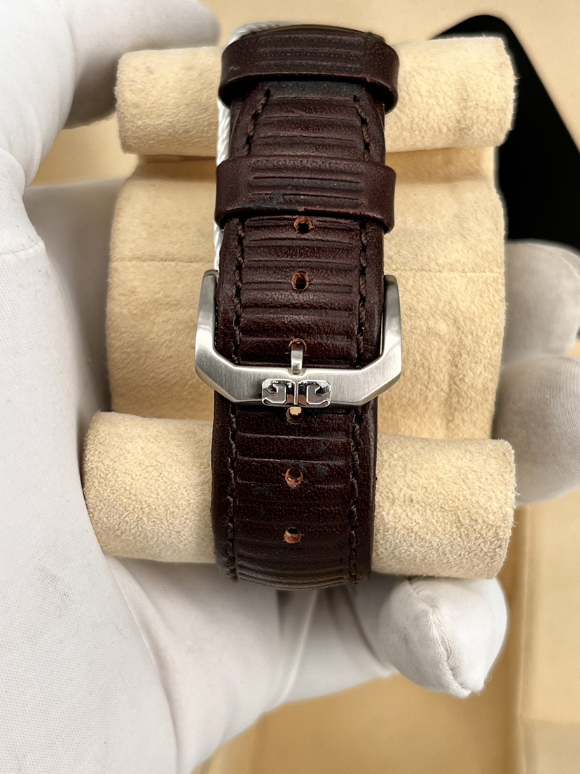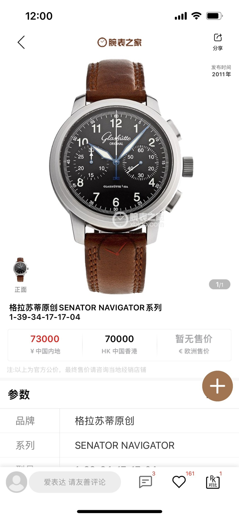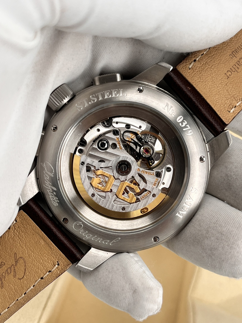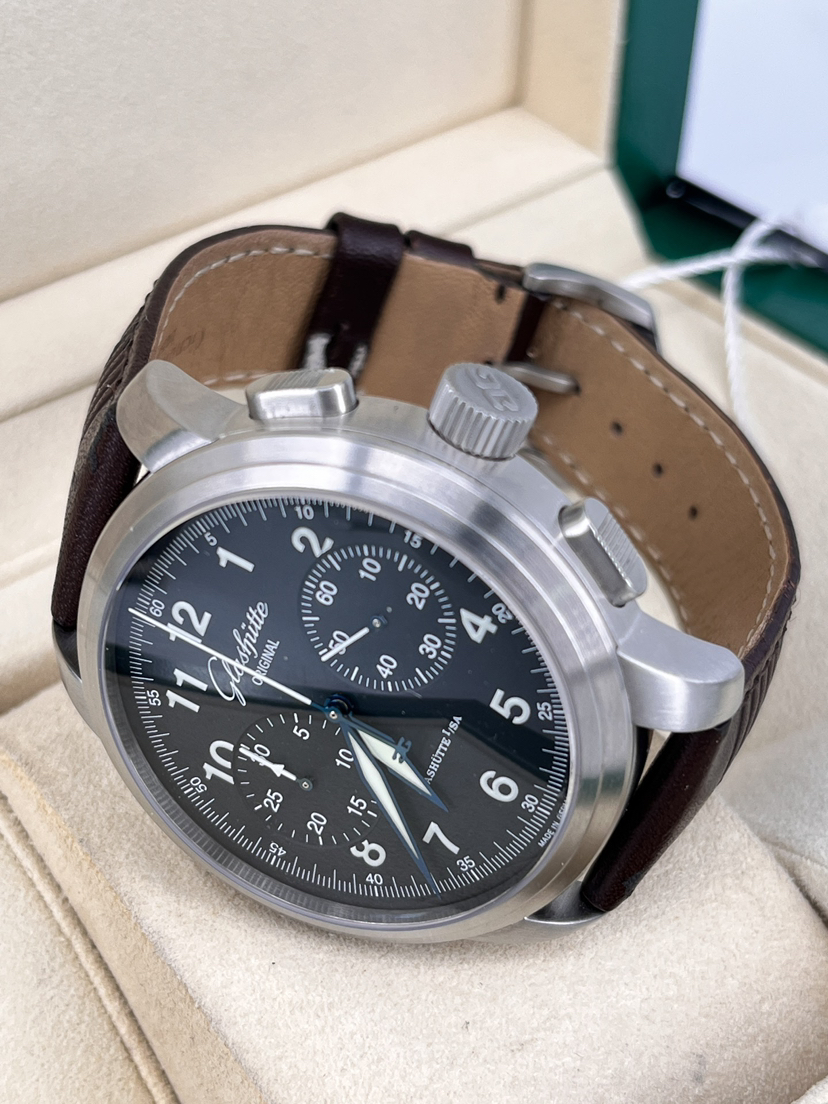 格拉苏蒂原创飞行员系列腕表,整表由精钢打造,表面做磨砂处理,44mm表径,黑色双眼计时表盘,阿拉伯数字时标清晰易读,蓝色指针,白色计时大秒针,搭载背透39-31自动机械机芯