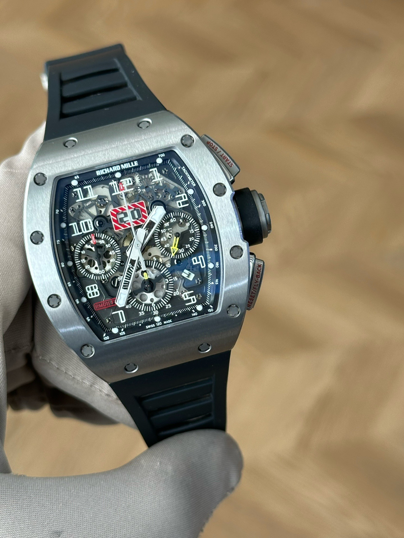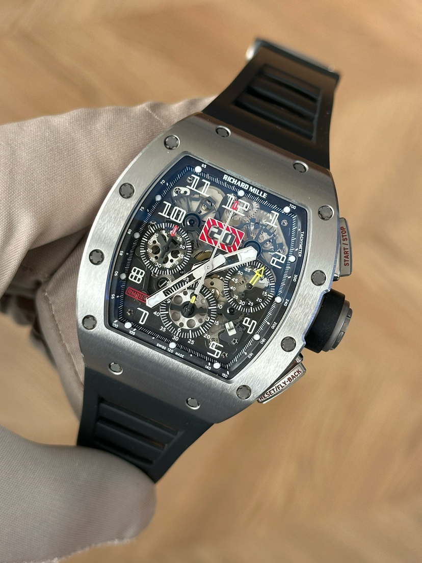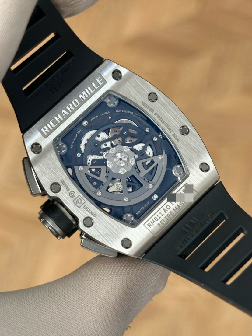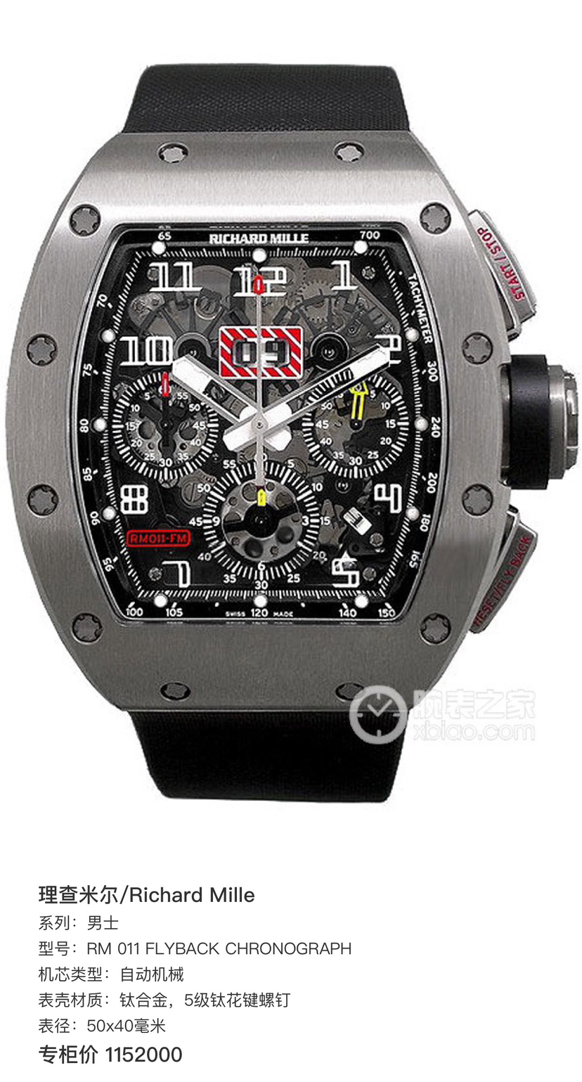 理查米尔/Richard Mille 男士 RM 011 FLYBACK CHRONOGRAPH 自动机械 钛合金,5级钛花键螺钉 50x40毫米;动力储备50小时;镂空背透设计;计时、月历、日期功能;专柜价1152000;15年未使用保卡附件有云鱼报告市面唯一