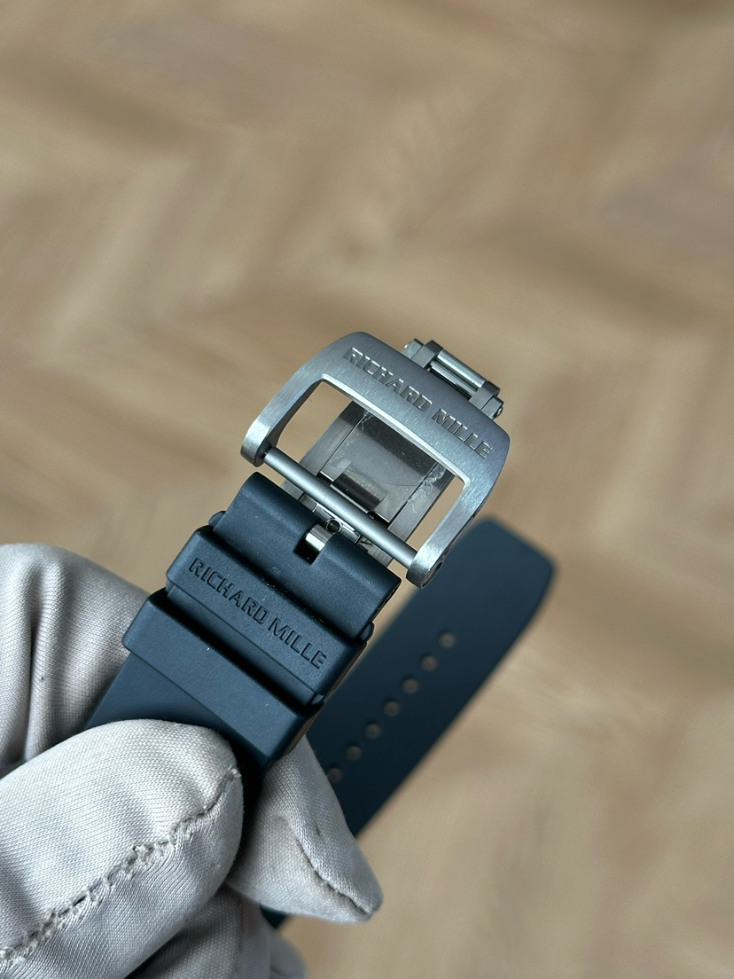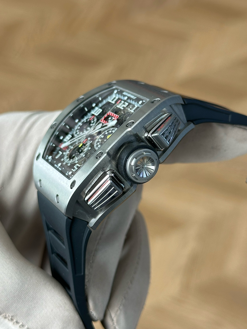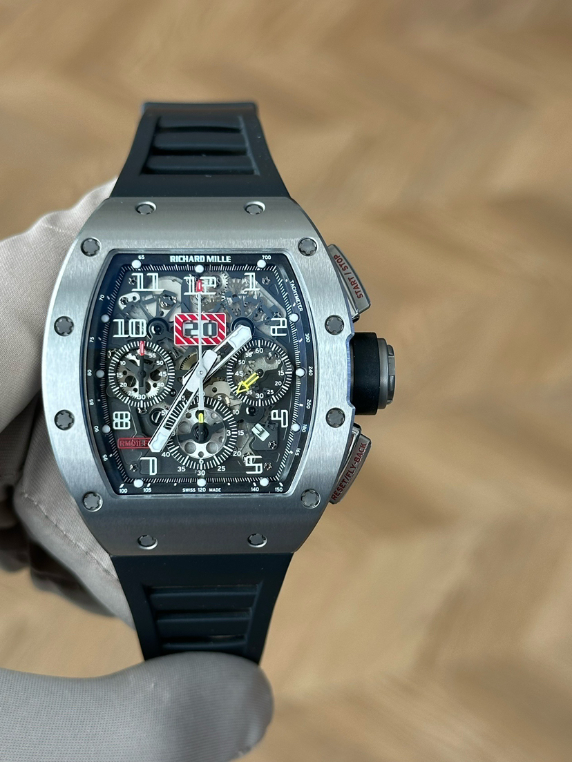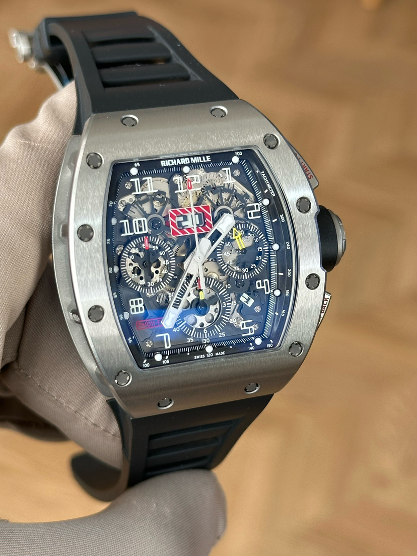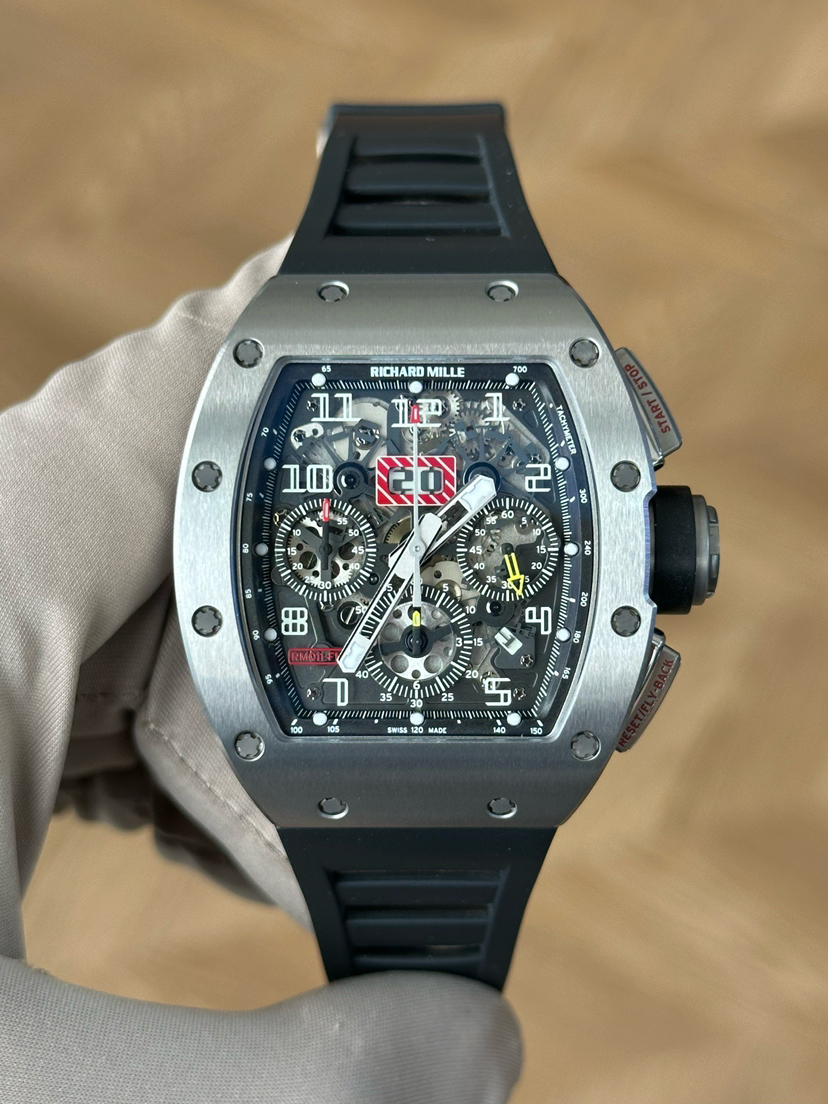 理查米尔/Richard Mille 男士 RM 011 FLYBACK CHRONOGRAPH 自动机械 钛合金,5级钛花键螺钉 50x40毫米;动力储备50小时;镂空背透设计;计时、月历、日期功能;专柜价1152000;15年未使用保卡附件有云鱼报告市面唯一
