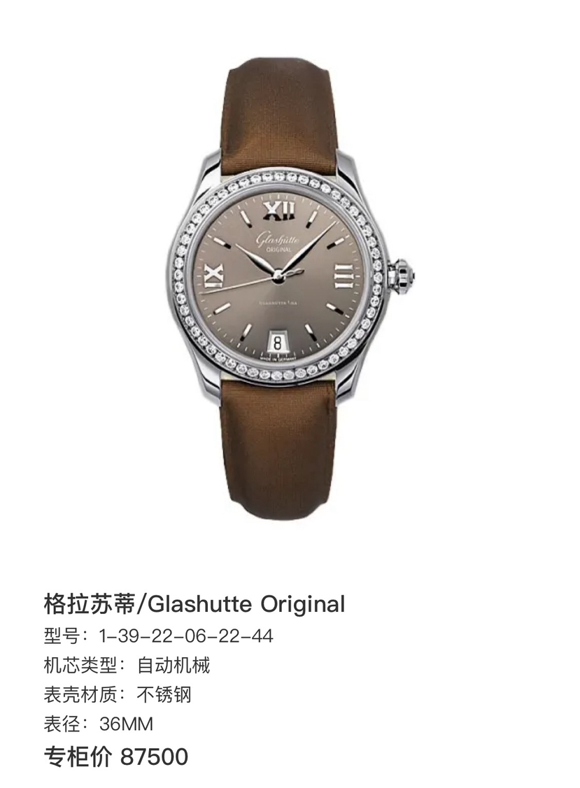 格拉苏蒂/Glashutte Original 型号:1-39-22-06-22-04 自动机械 不锈钢 36MM 附件:单表 专柜价87500