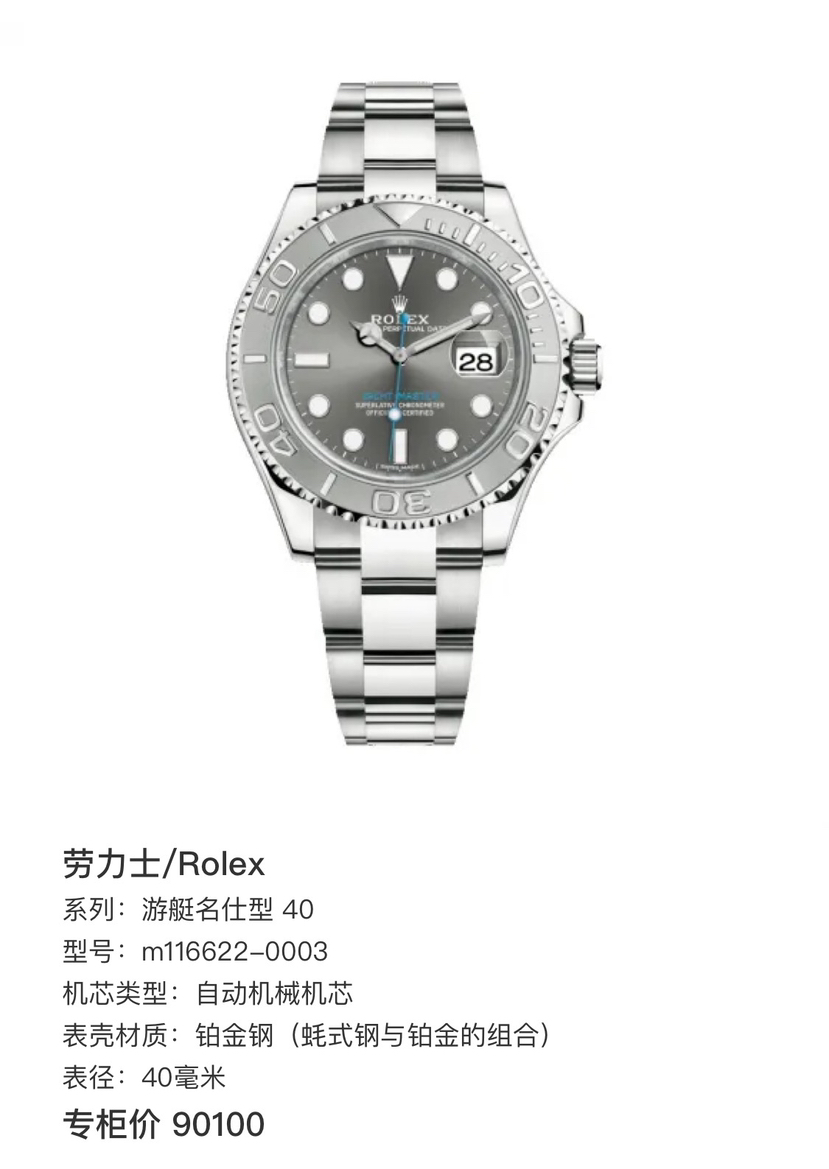 劳力士/Rolex 游艇名仕型 40 m116622-0003 自动机械机芯 铂金钢(蚝式钢与铂金的组合) 40毫米 专柜价90100