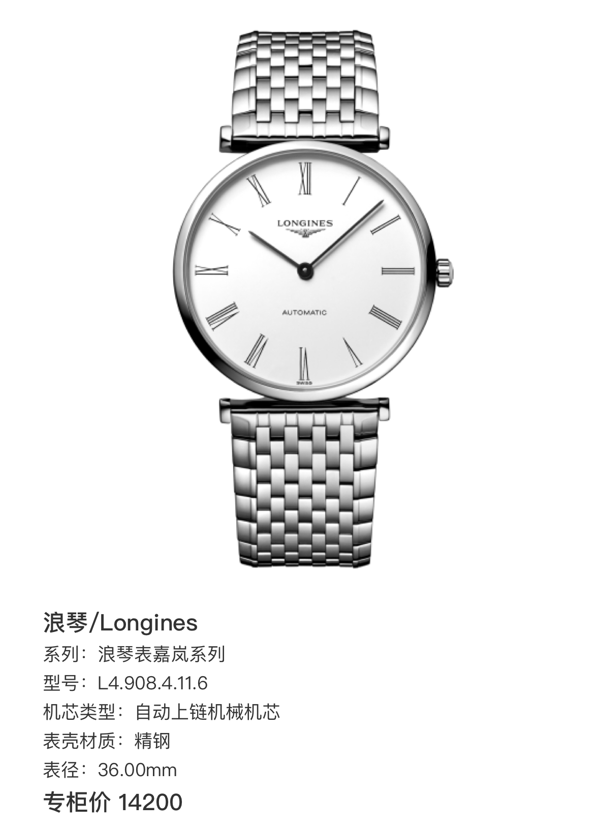 浪琴/Longines 浪琴表嘉岚系列 L4.908.4.11.6 自动上链机械机芯 精钢 36.00mm 专柜价14200。
