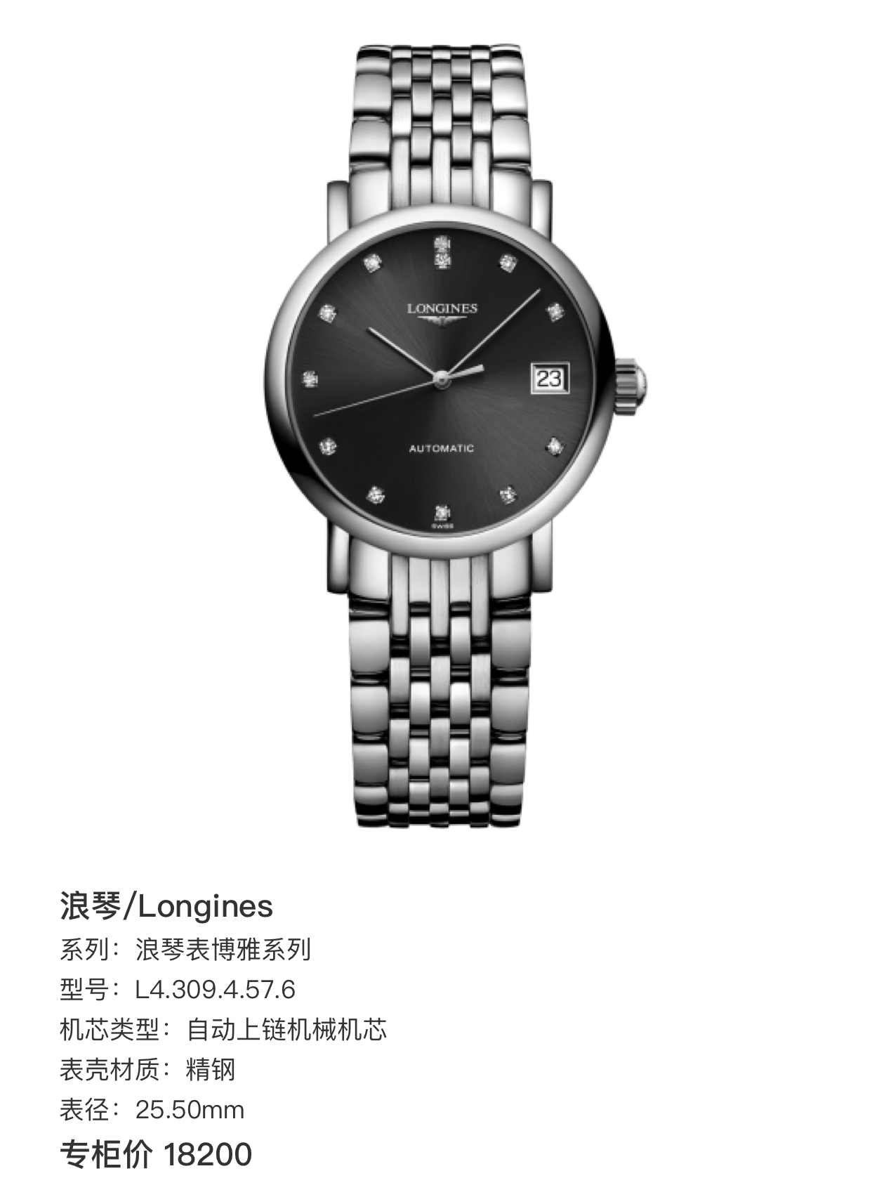 新浪琴表博雅系列 L4.309.4.57.6 自动上链机械机芯 精钢 25.50mm 专柜价18200。