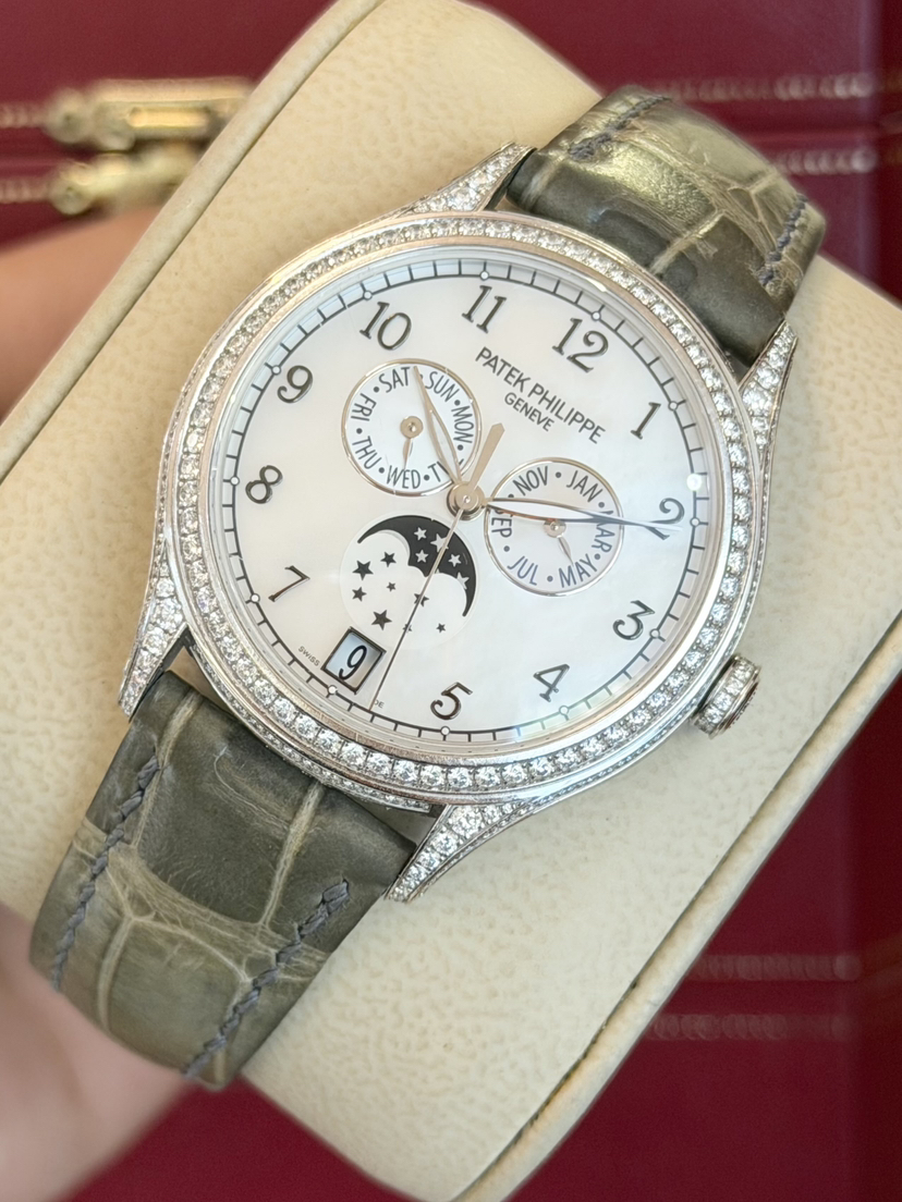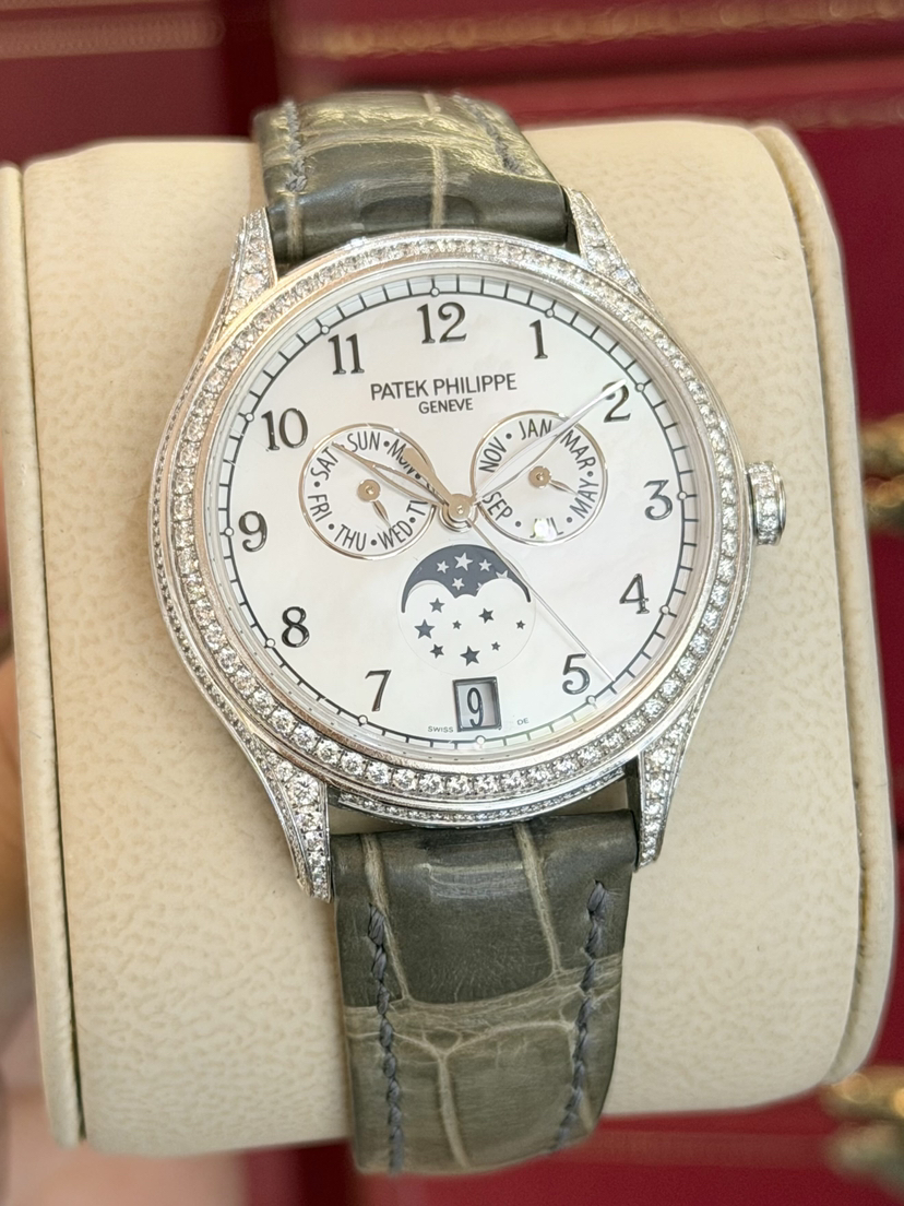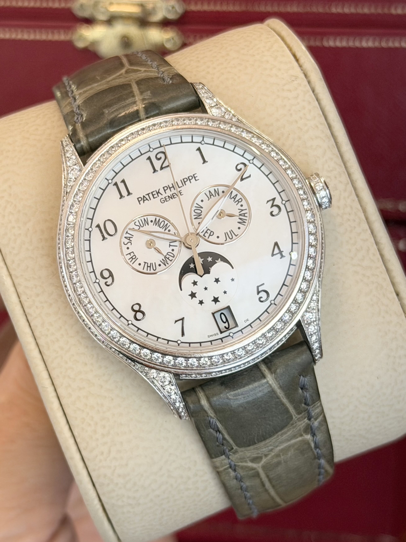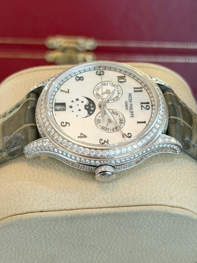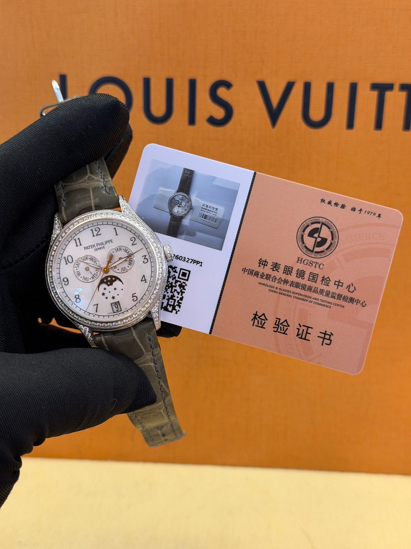 4948G-010女士自动机械腕表 表径38毫米 白色贝壳表盘 带国检卡 数字刻度/日期/星期/月份/月相等功能显示 18K白金表壳 原镶钻石 76字头 24年单表 原价864300 店内现货好价