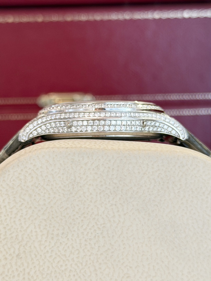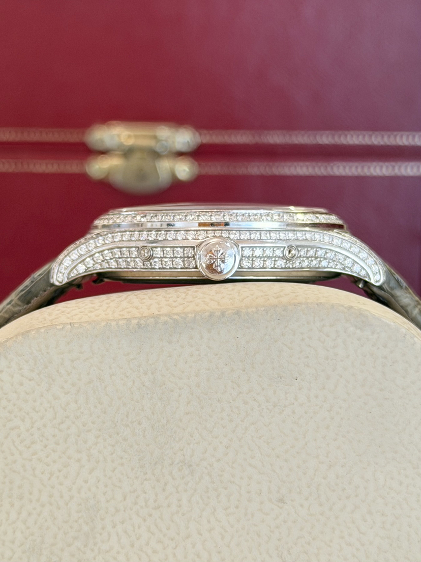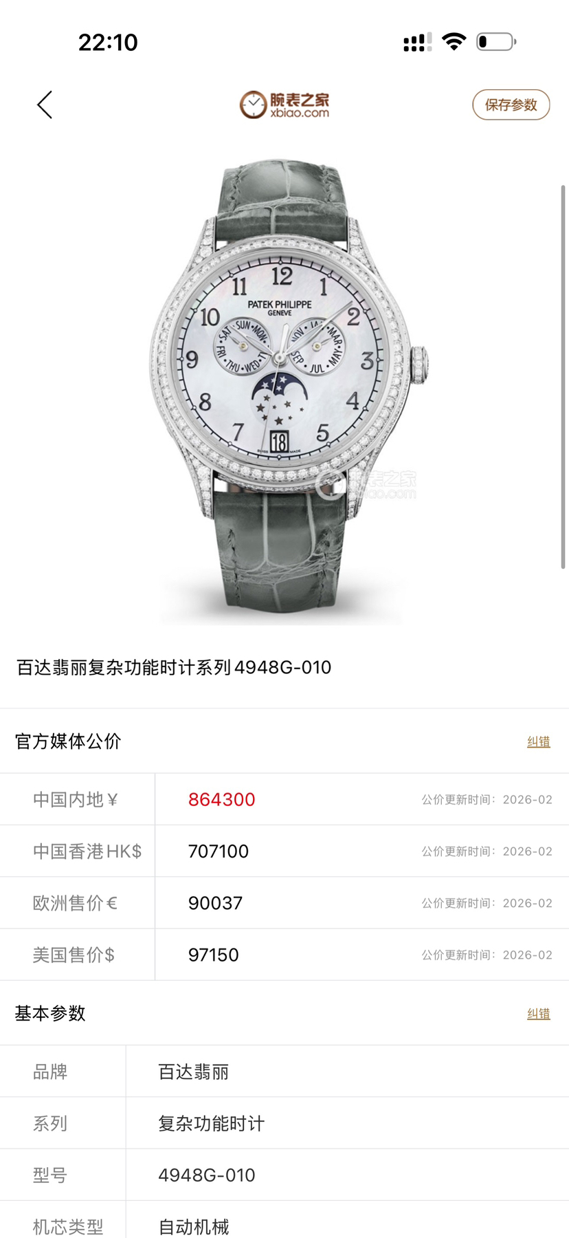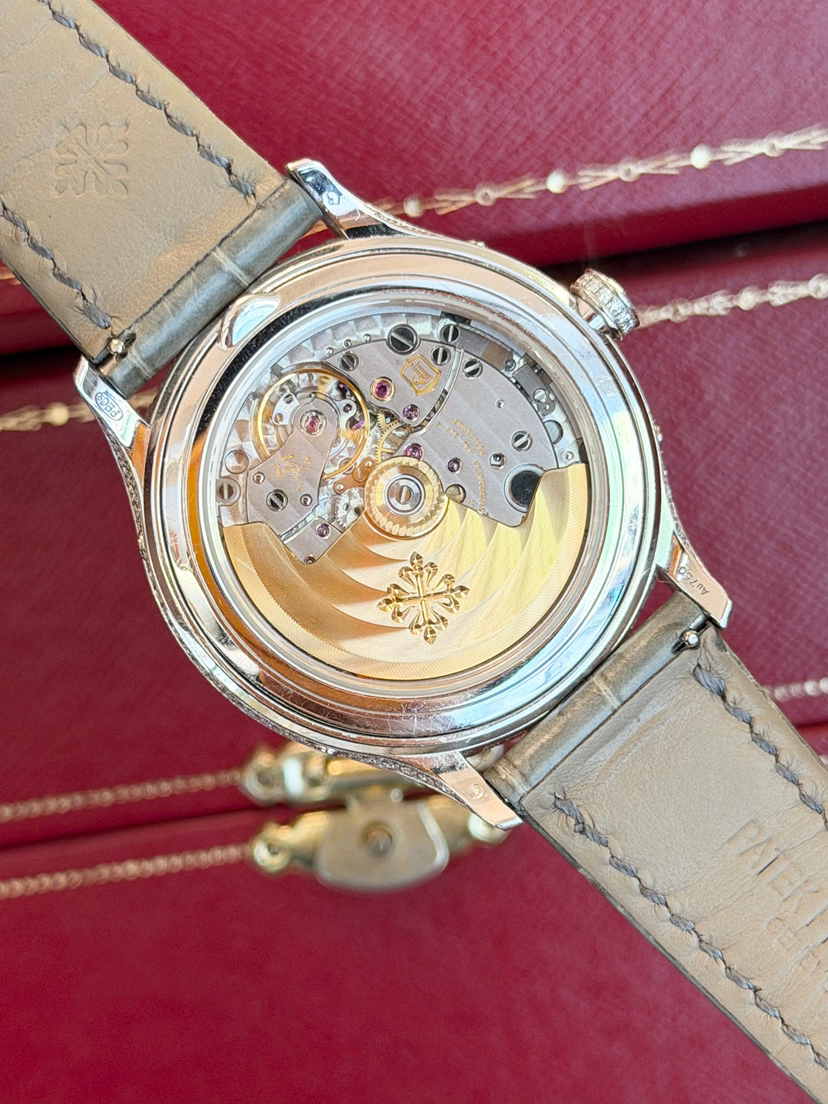 4948G-010女士自动机械腕表 表径38毫米 白色贝壳表盘 带国检卡 数字刻度/日期/星期/月份/月相等功能显示 18K白金表壳 原镶钻石 76字头 24年单表 原价864300 店内现货好价