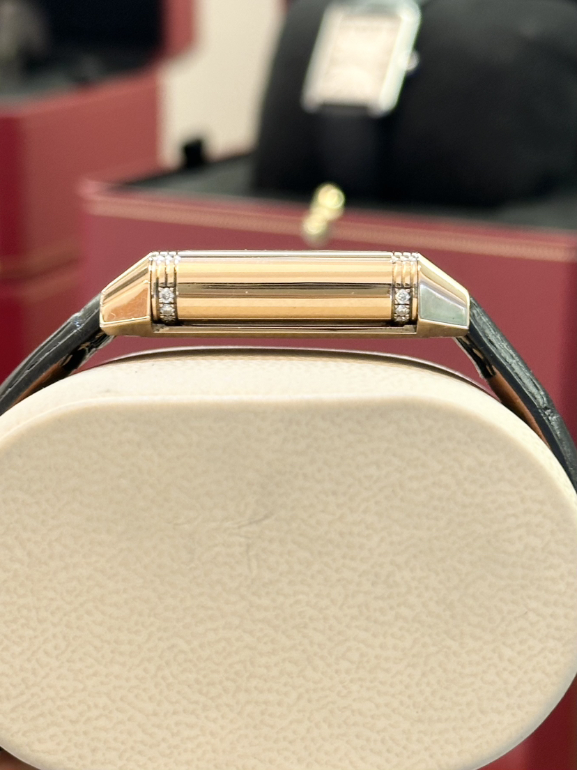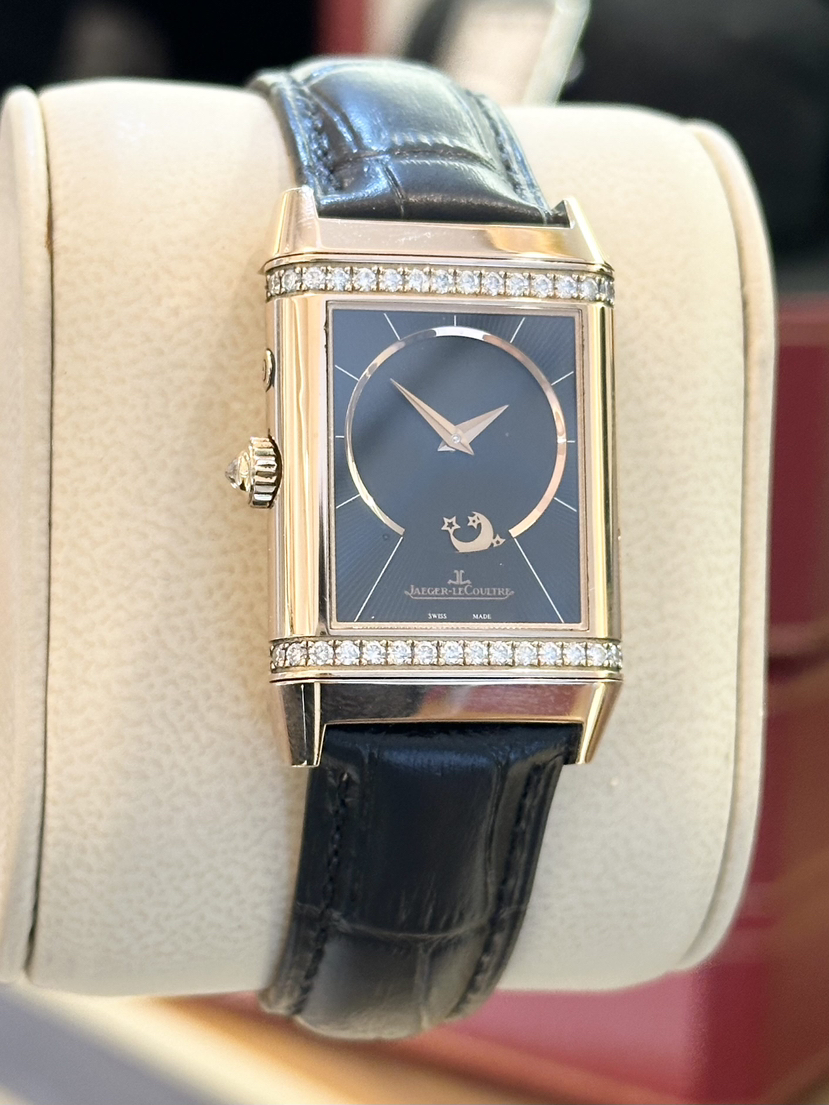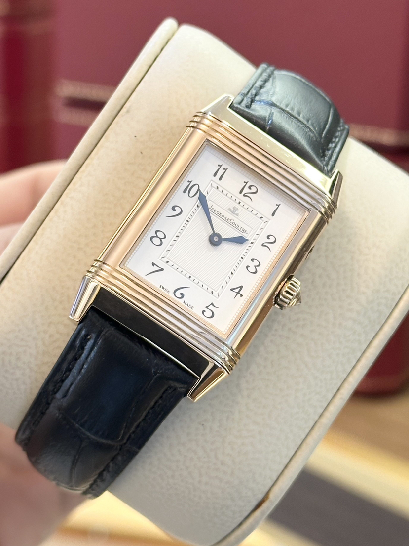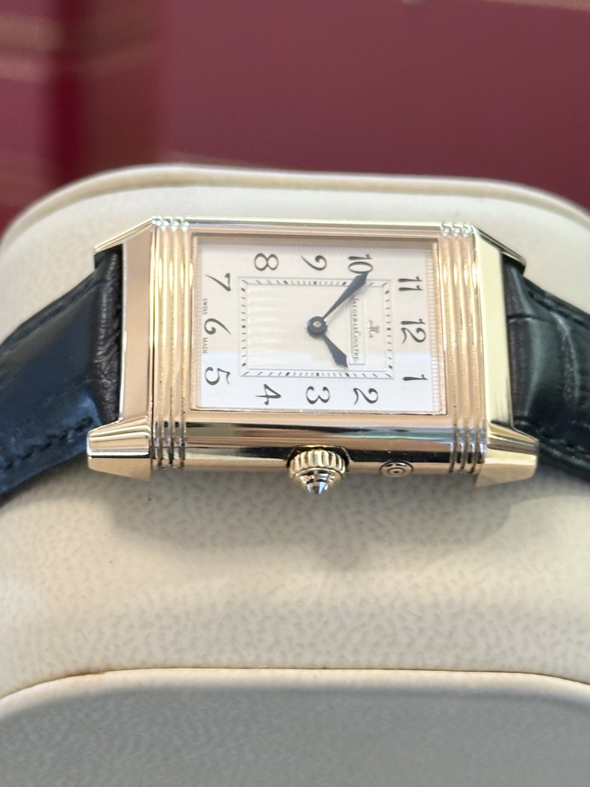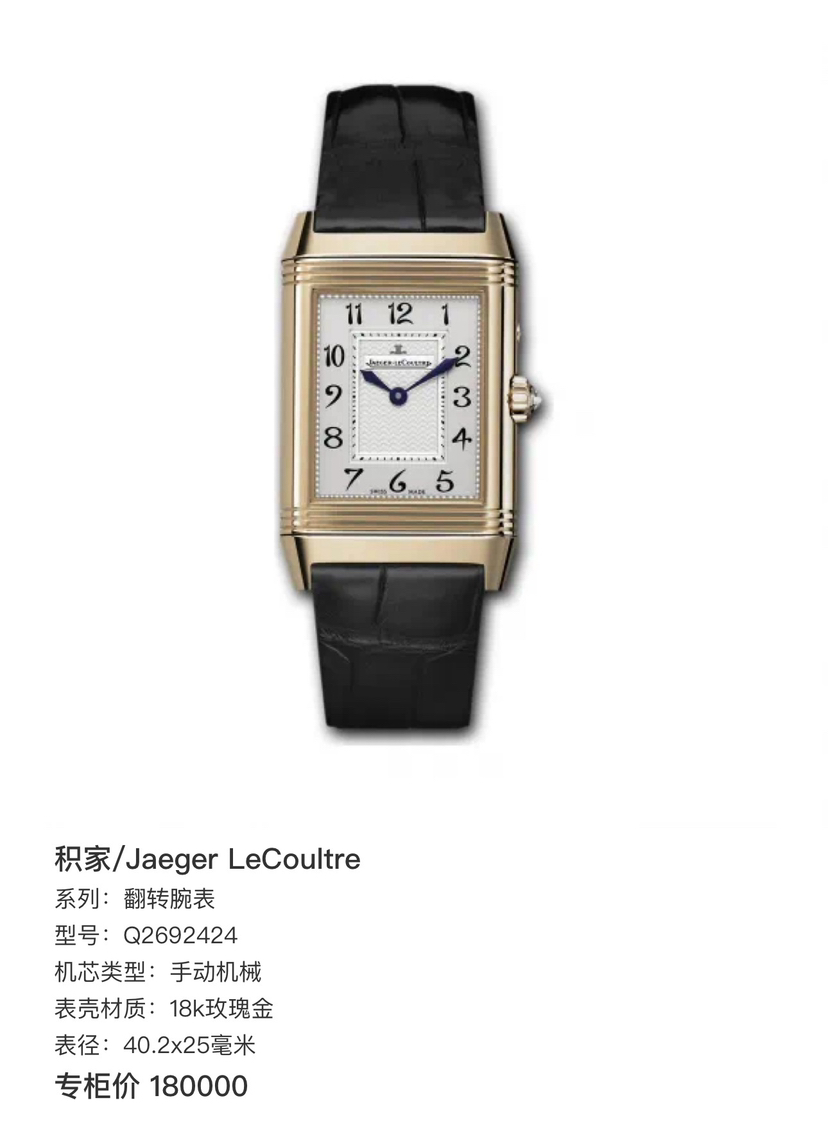 【积家】翻转系列Q2692424女士手动机械腕表 表径25-42.2毫米18k玫瑰金材质 阿拉伯数字刻度 双面翻转 拥有女性柔美气质的ReversoDuetto双面双时区翻转腕表折射出高级制表 原价180000,店内现货好价