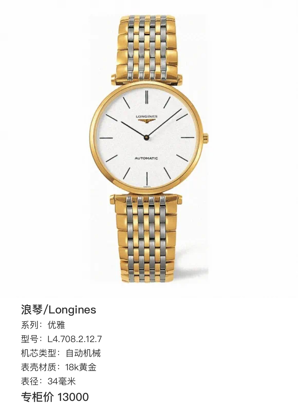 浪琴/Longines 优雅 L4.708.2.12.7 自动机械 18k黄金 34毫米 专柜价13000