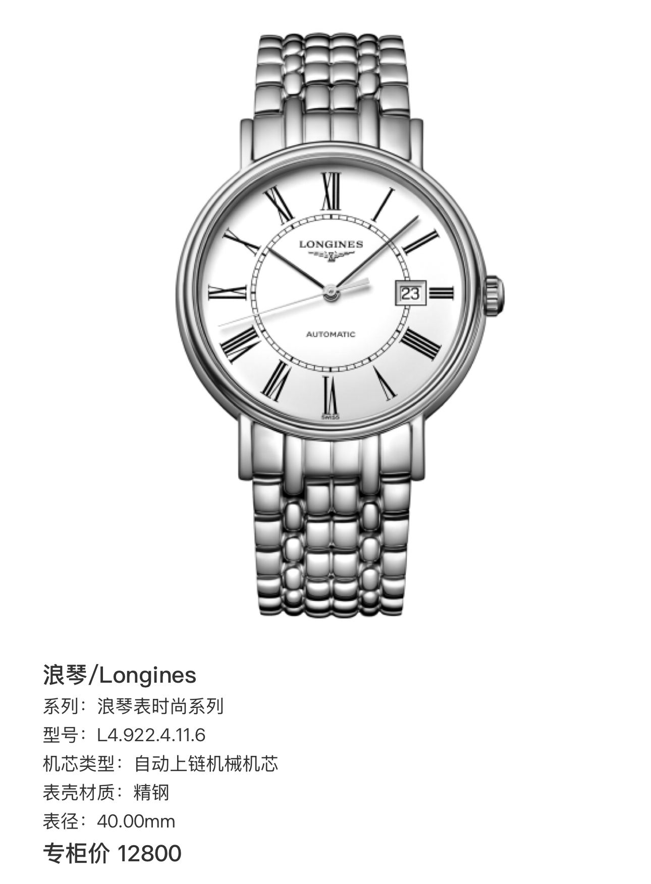 浪琴/Longines 浪琴表时尚系列 L4.922.4.11.6 自动上链机械机芯 精钢 40.00mm 专柜价12800。
