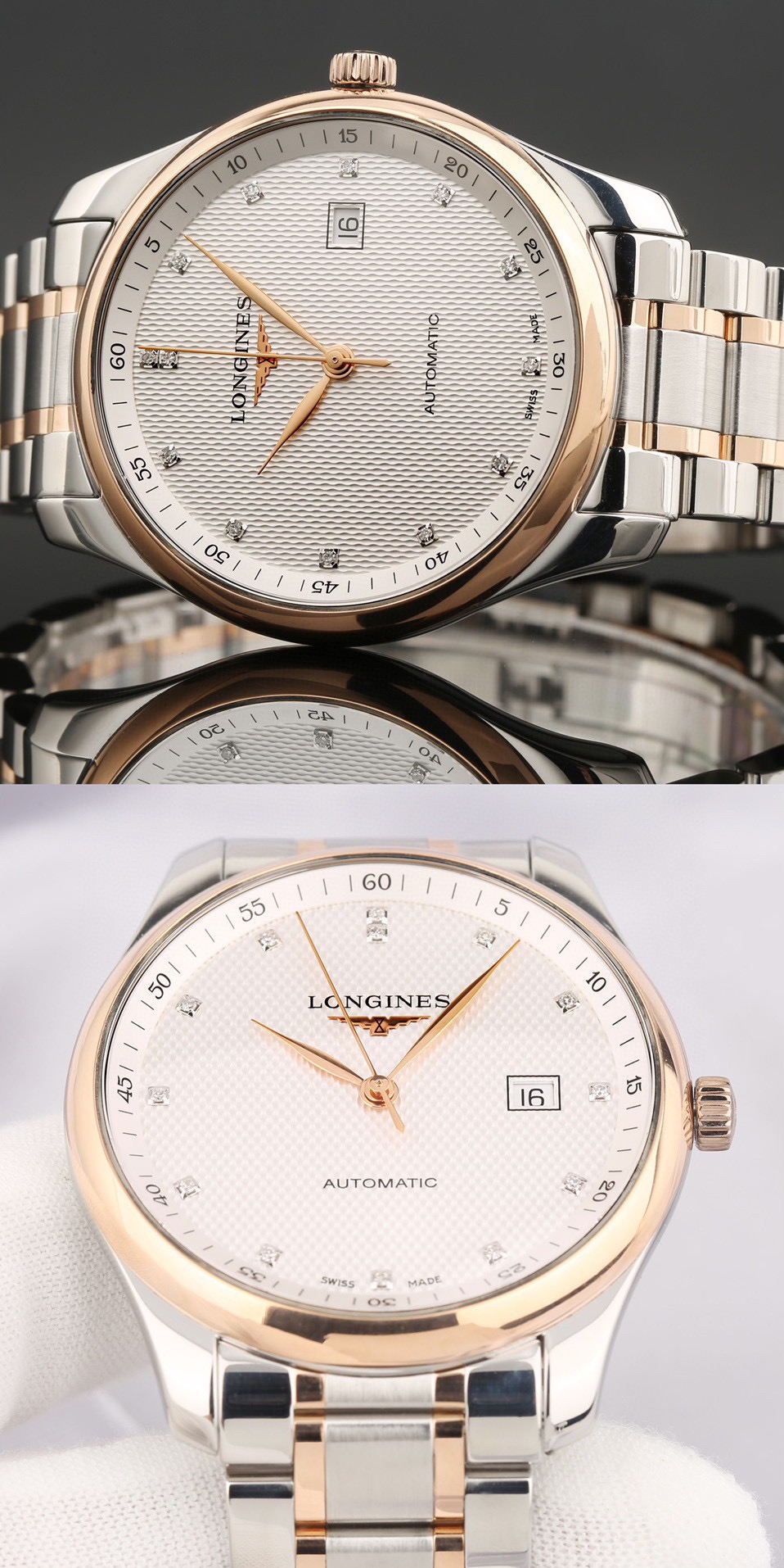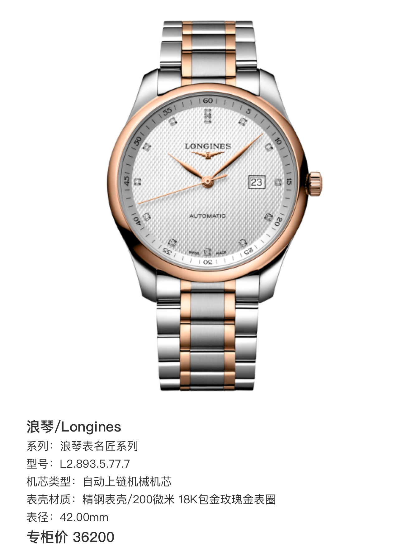 浪琴/Longines 浪琴表名匠系列 L2.893.5.77.7 自动上链机械机芯 精钢表壳/200微米 18K包金玫瑰金表圈 42.00mm 专柜价36200。