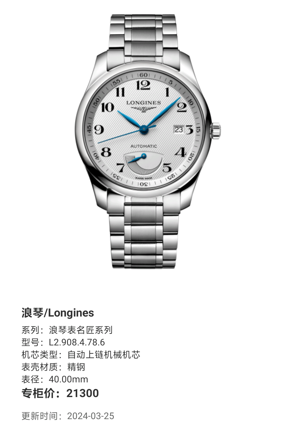 浪琴/Longines 浪琴表名匠系列 L2.908.4.78.6 自动上链机械机芯 精钢 40.00mm 专柜价21300。