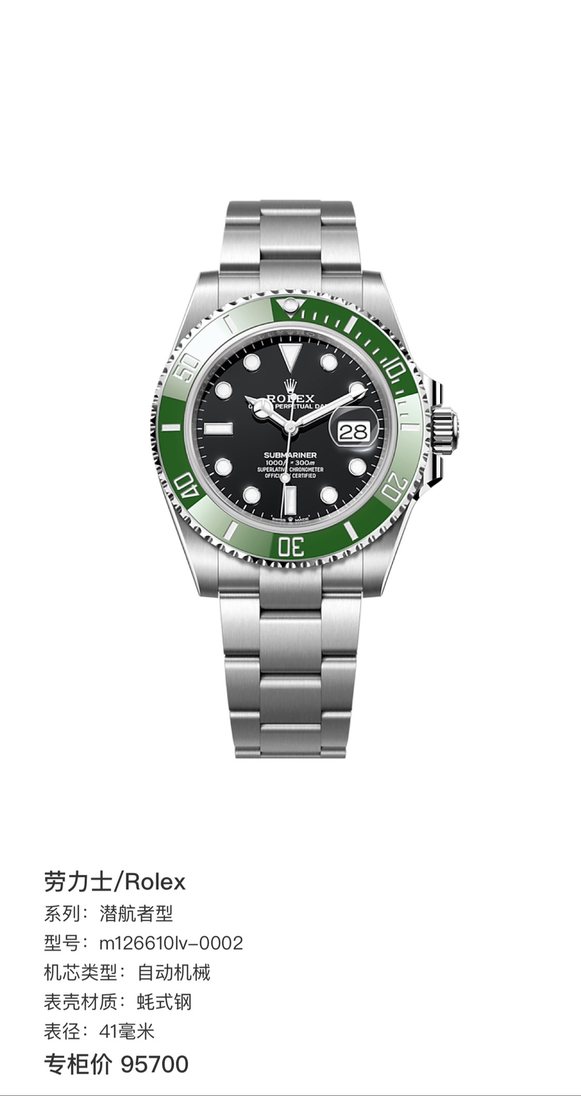 劳力士/Rolex 潜航者型 m126610lv-0002 自动机械 蚝式钢 41毫米 附件:23年全套专柜价95700