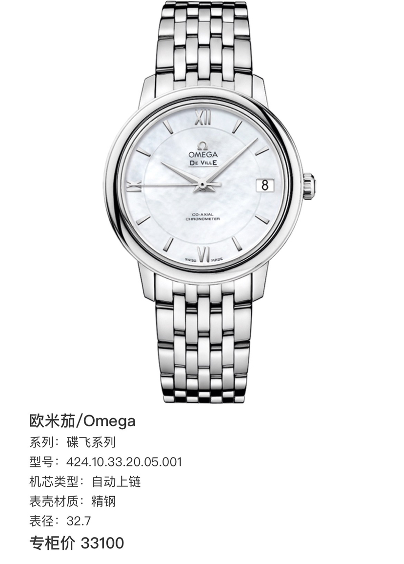 欧米茄 碟飞系列 424.10.33.20.05.001 自动上链 精钢 32.7mm表径 专柜价33100 单表好价。