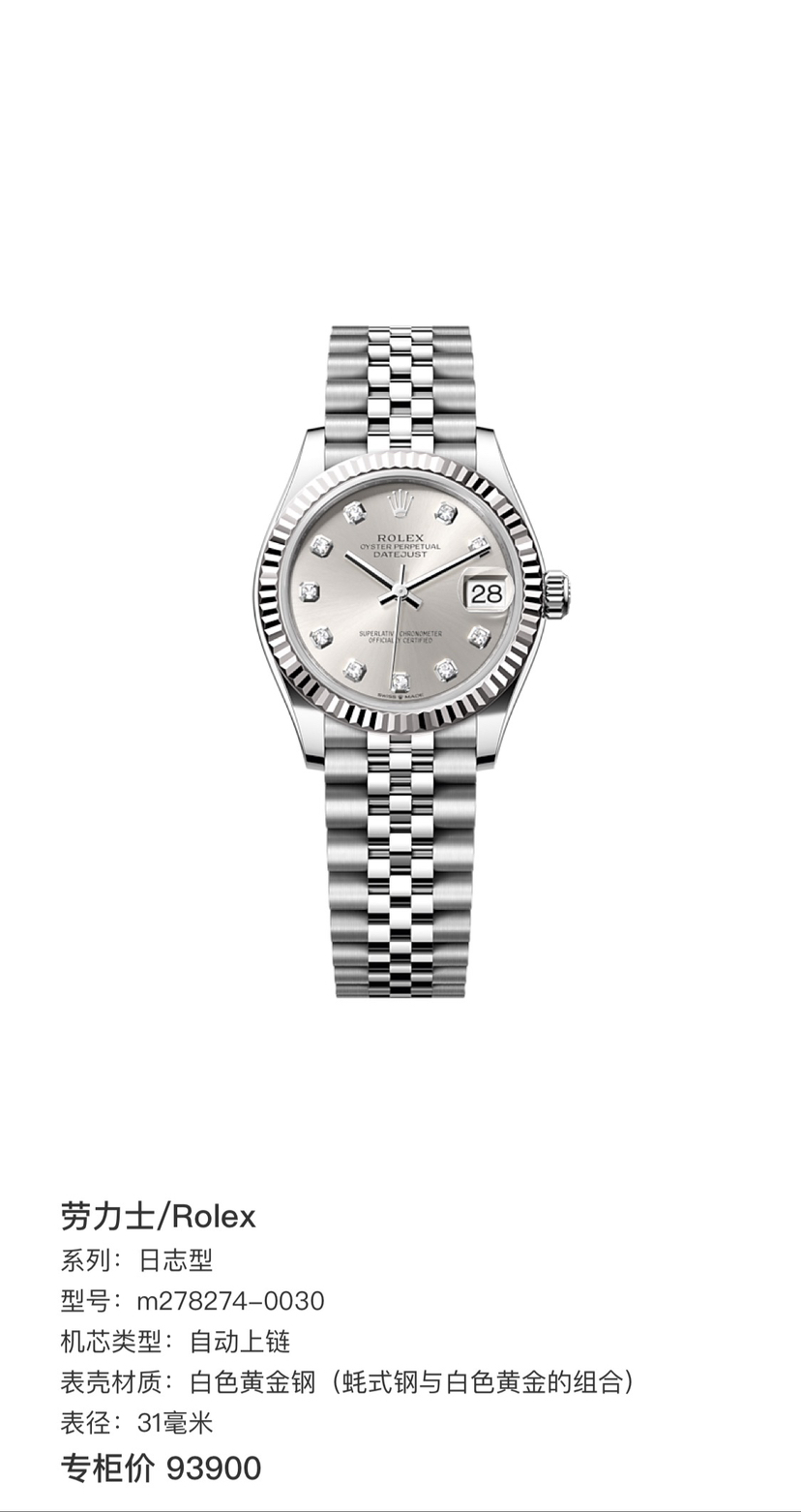 劳力士/Rolex 日志型 m278274-0030 自动上链 白色黄金钢(蚝式钢与白色黄金的组合) 31毫米 专柜价93900