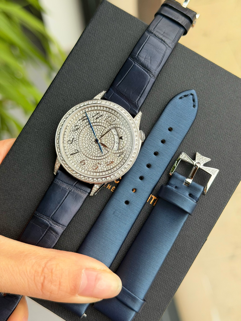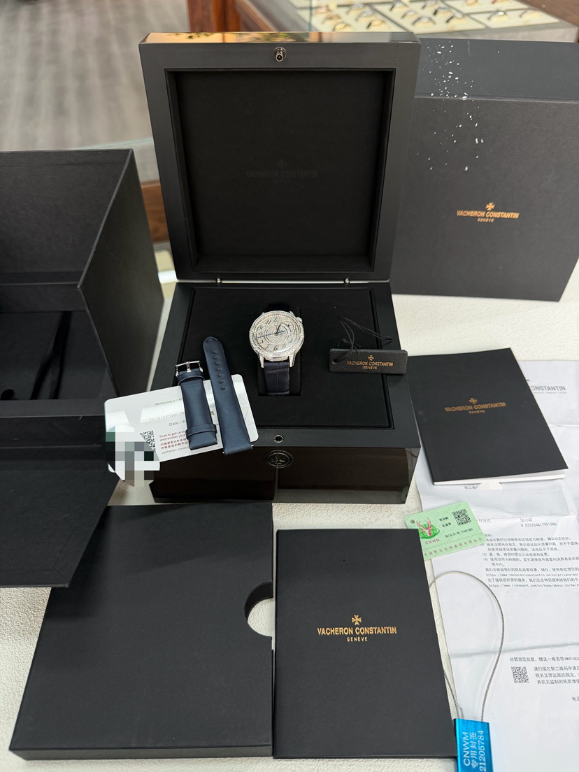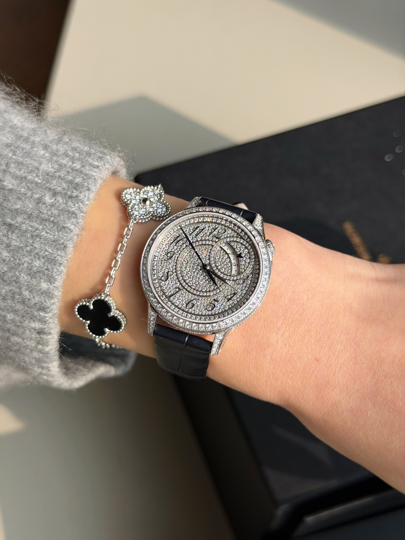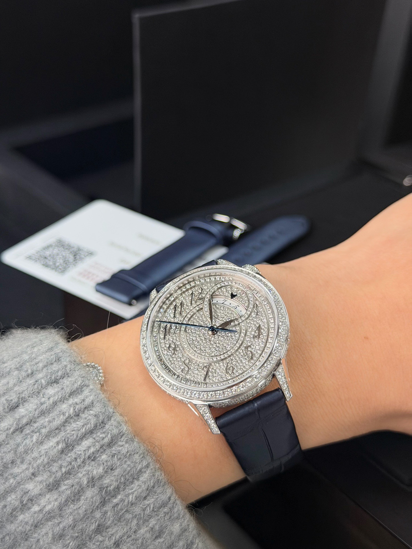 35mm表径,18K白金材质,表盘镶满天星钻石,自动机械 黑色鳄鱼皮表带,成色极品新,专柜价585000 2022年国行大全套,带销售单据。8年保修,现货在店 好价!好折扣