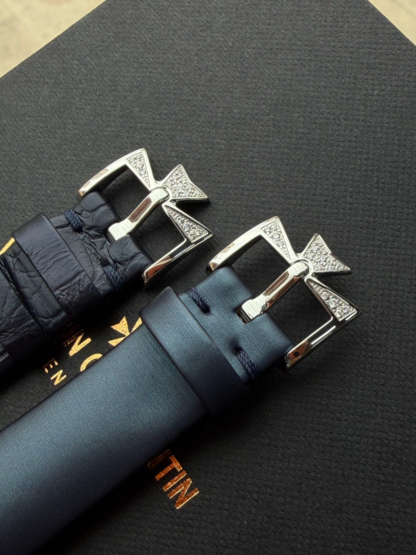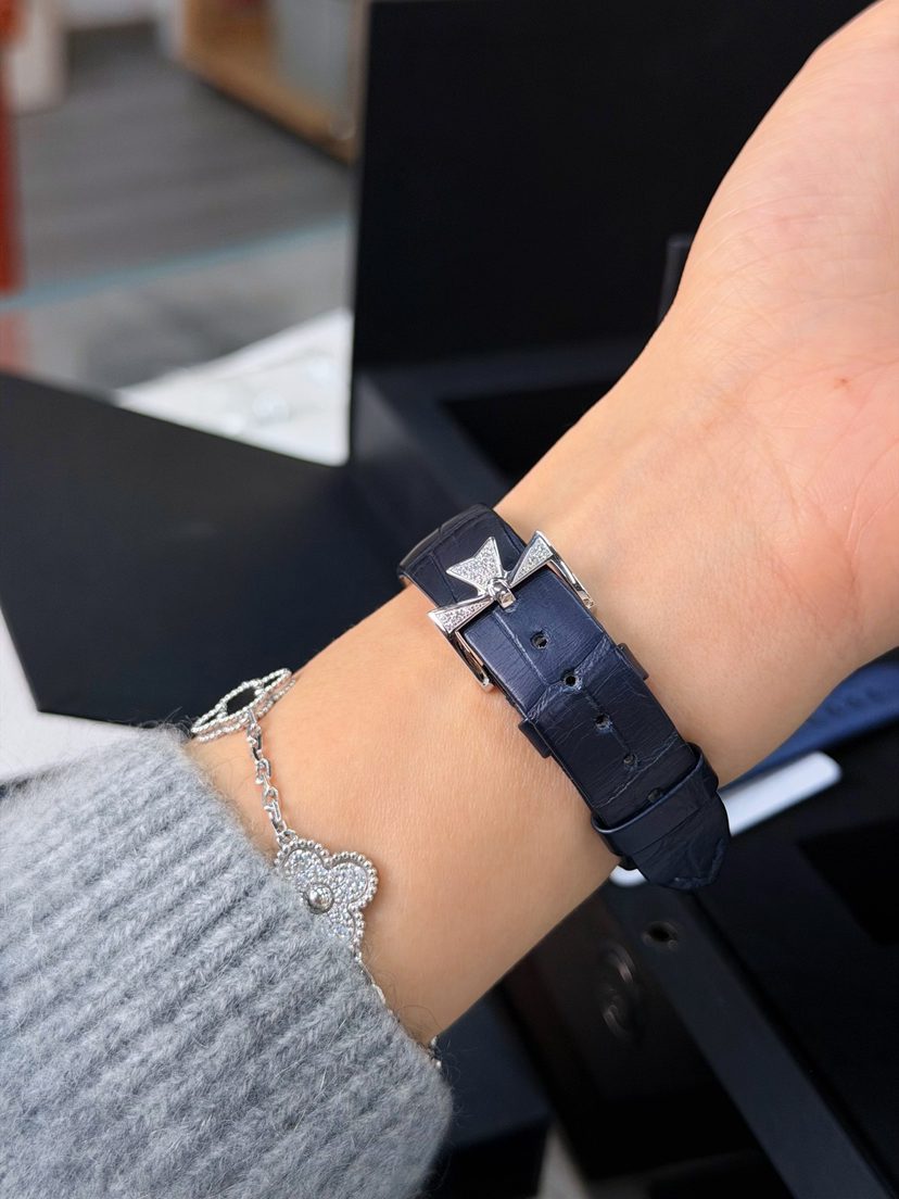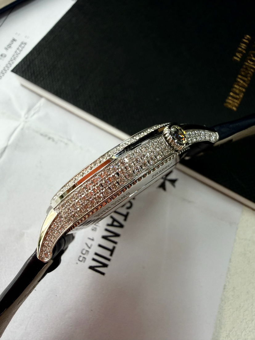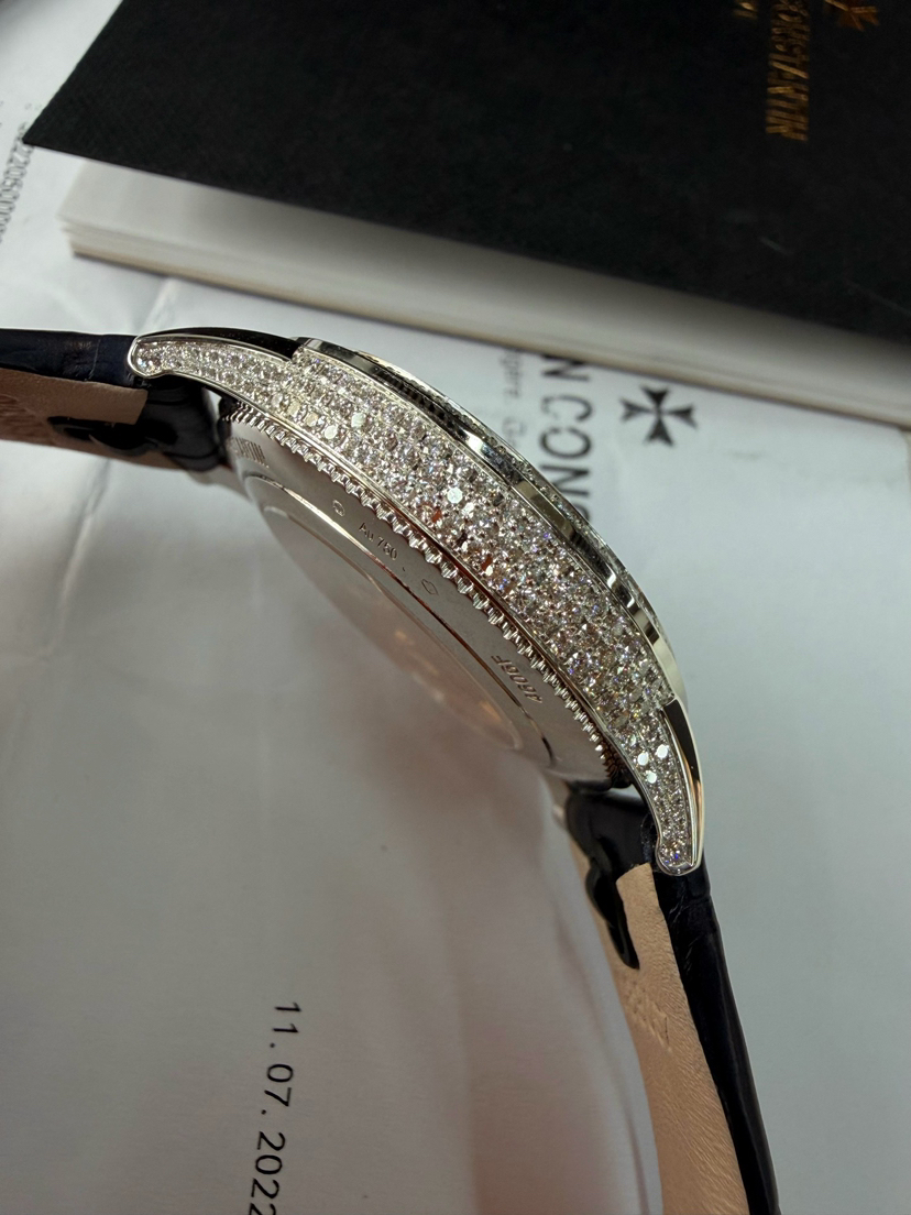 35mm表径,18K白金材质,表盘镶满天星钻石,自动机械 黑色鳄鱼皮表带,成色极品新,专柜价585000 2022年国行大全套,带销售单据。8年保修,现货在店 好价!好折扣