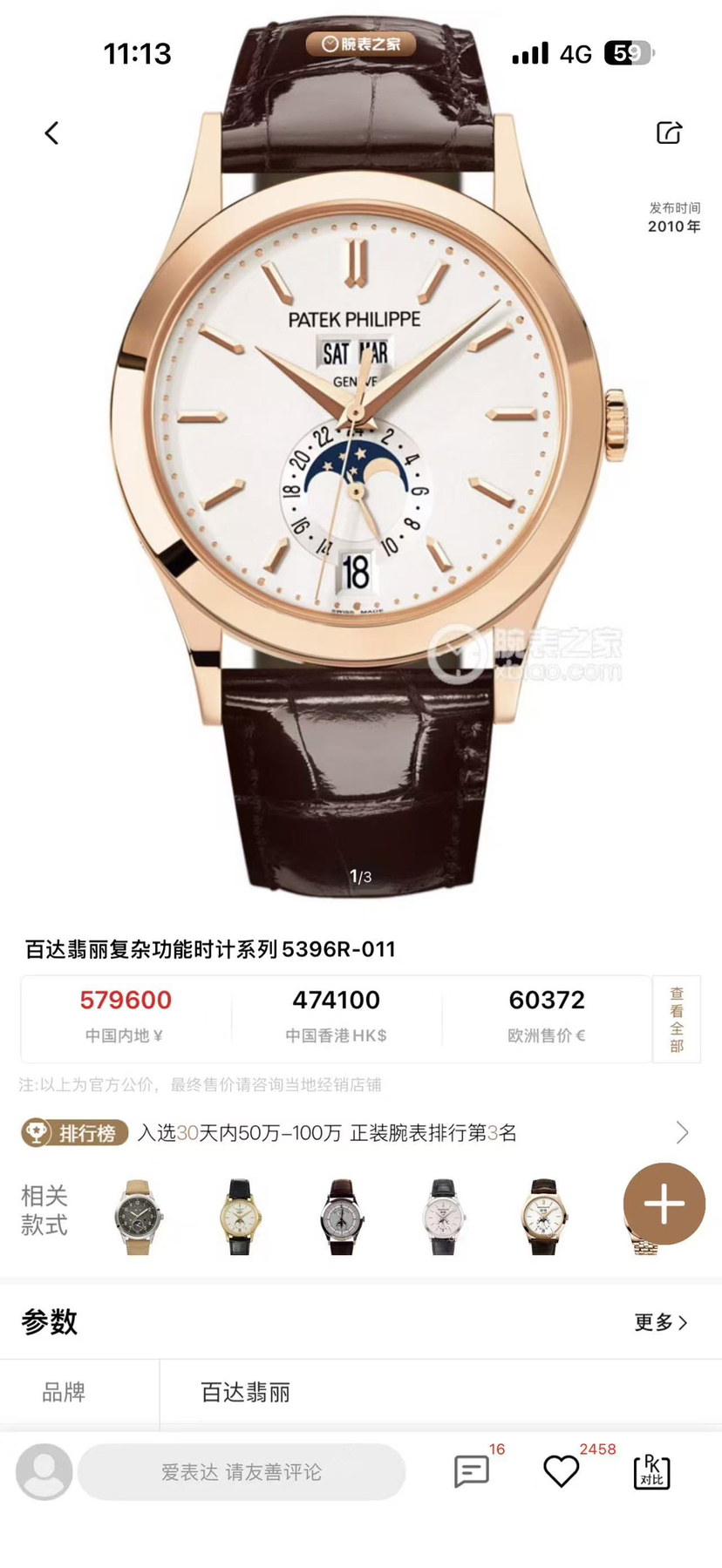 百达翡丽/Patek Philippe 复杂功能时计系列 5396R-011 自动上弦 玫瑰金款式 表壳直径:38.5mm厚度:11.2毫米 专柜价579600