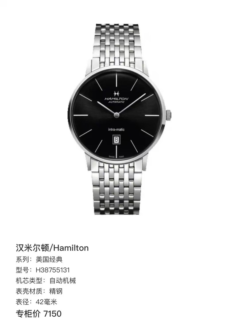 闲置未使用品 Hamilton 汉米尔顿 美国经典系列 H38755131,自动机械男表,表径42mm,表带全长,公价¥7150