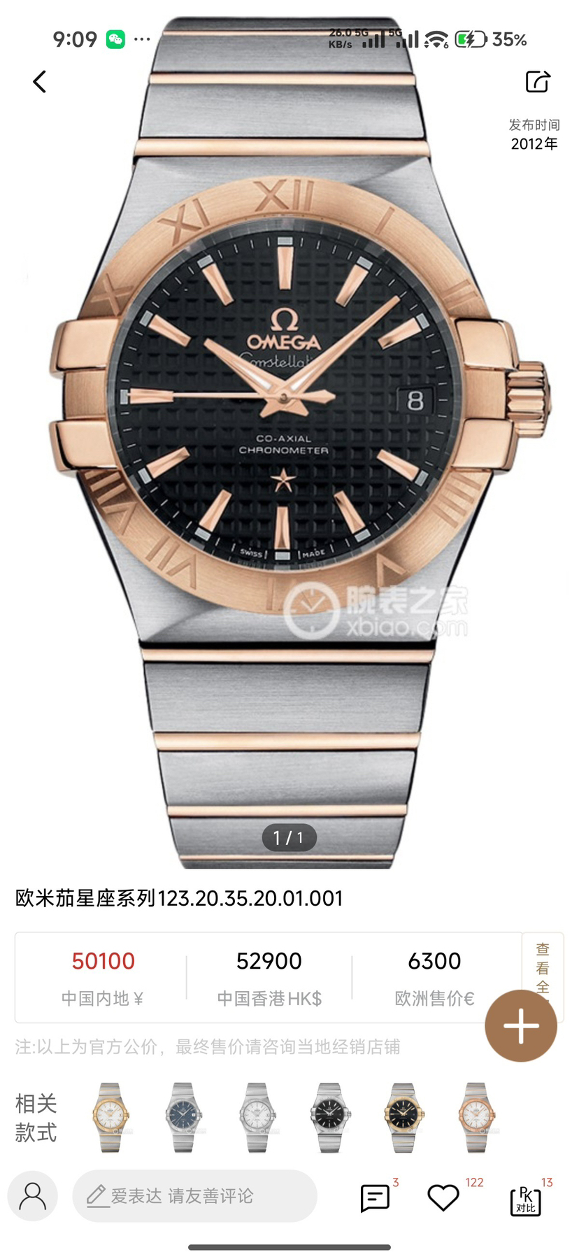 欧米茄 星座系列123.20.35.20.01.001 35毫米表经 18k金表圈 背透2500机芯 公价50100元 国行全新未使用26年3月卡,现货好价!