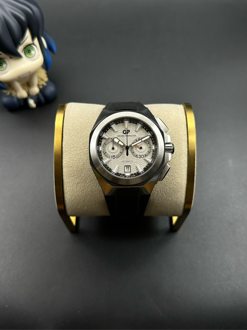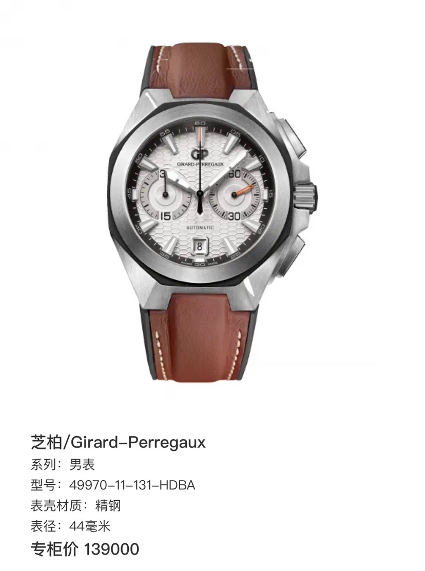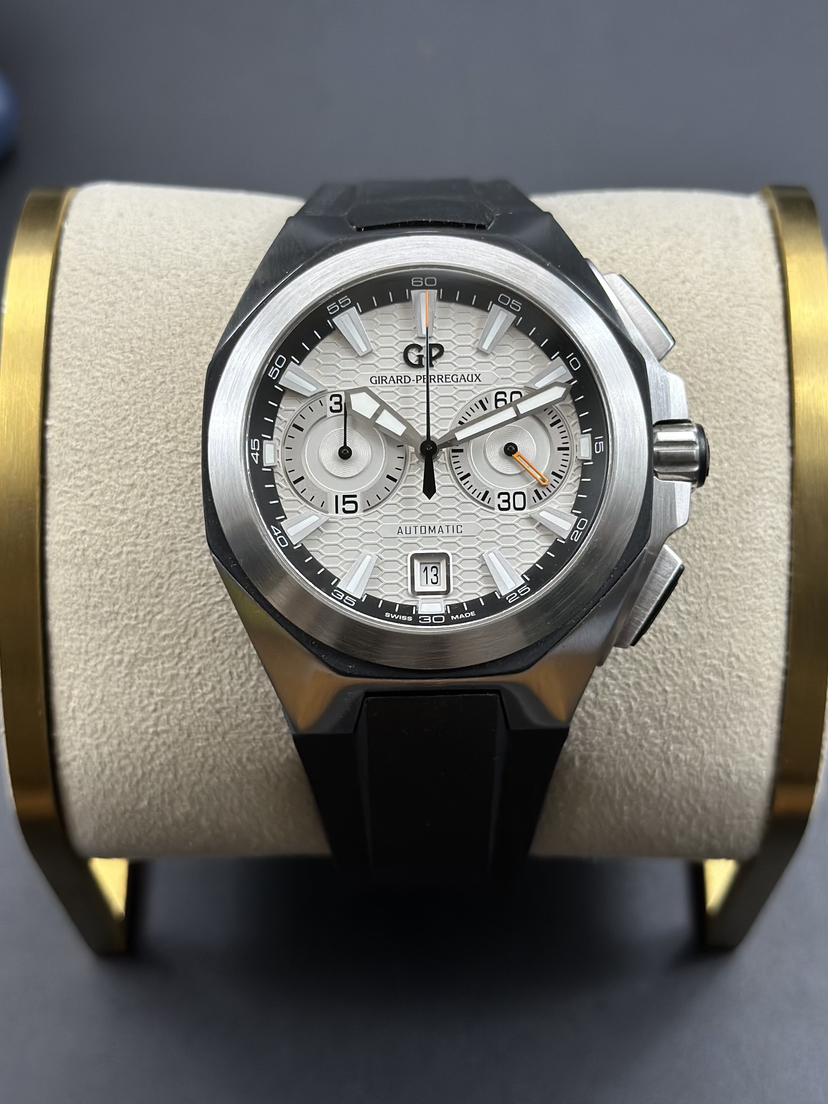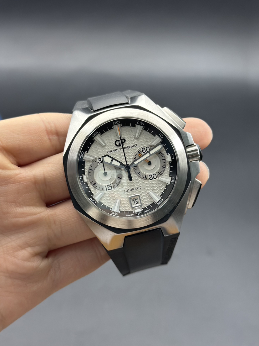 芝柏 Chrono Hawk系列 49970-11-131-HDBA男士机械腕表 表径44mm 厚度15mm 白色雕刻图案表盘,GP03300-0073自产机芯,熊猫眼表盘,两眼计时和日期显示 黑色橡胶表带 品相完美 专柜售价139000 现货好价!