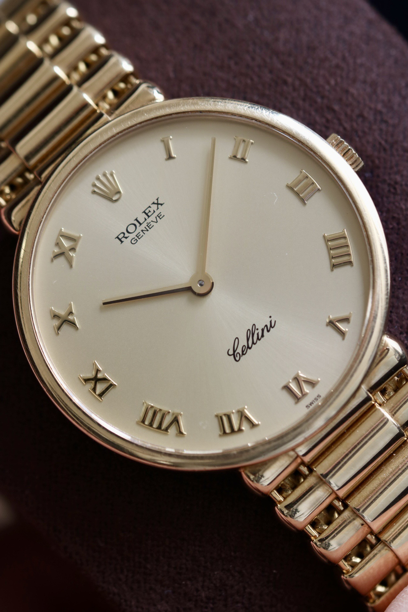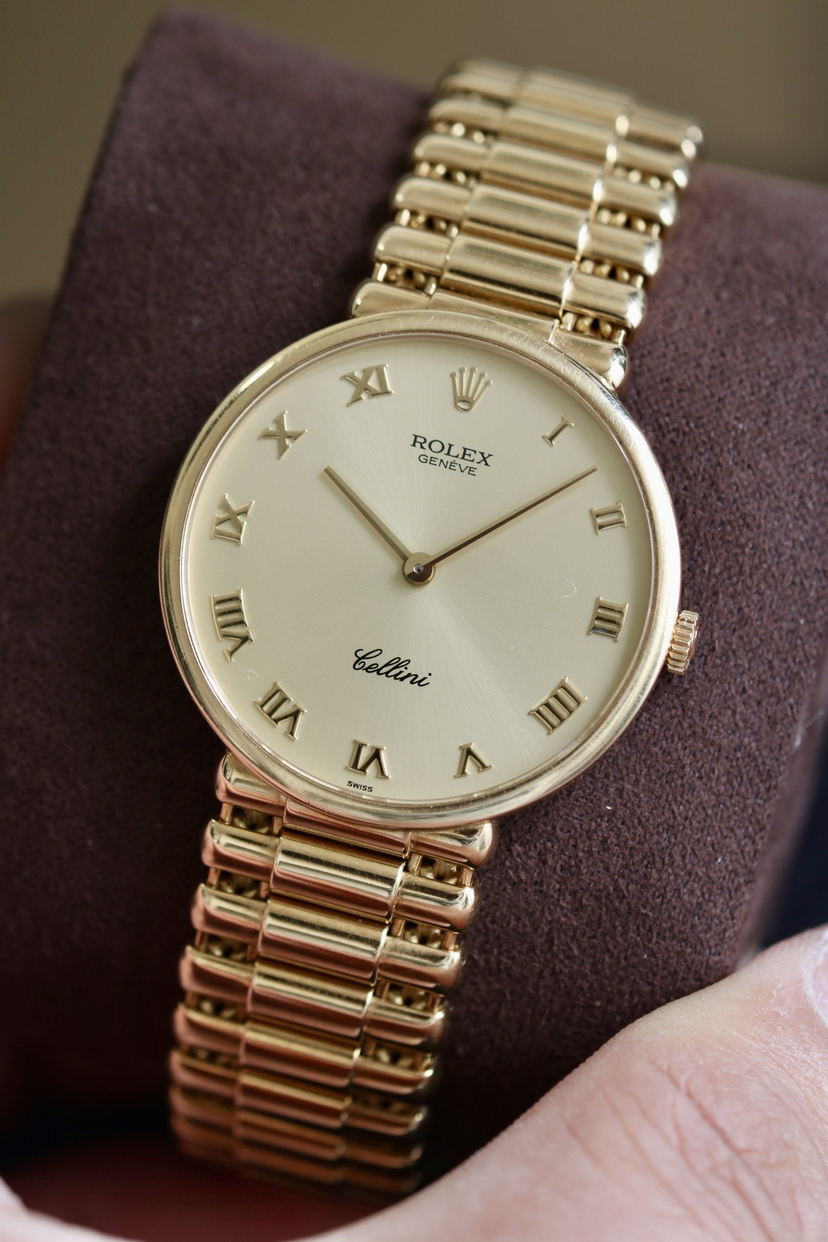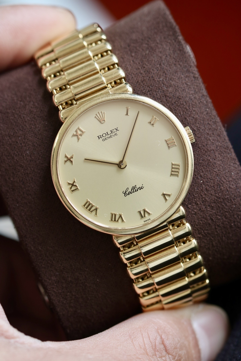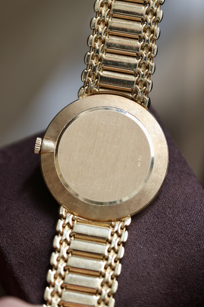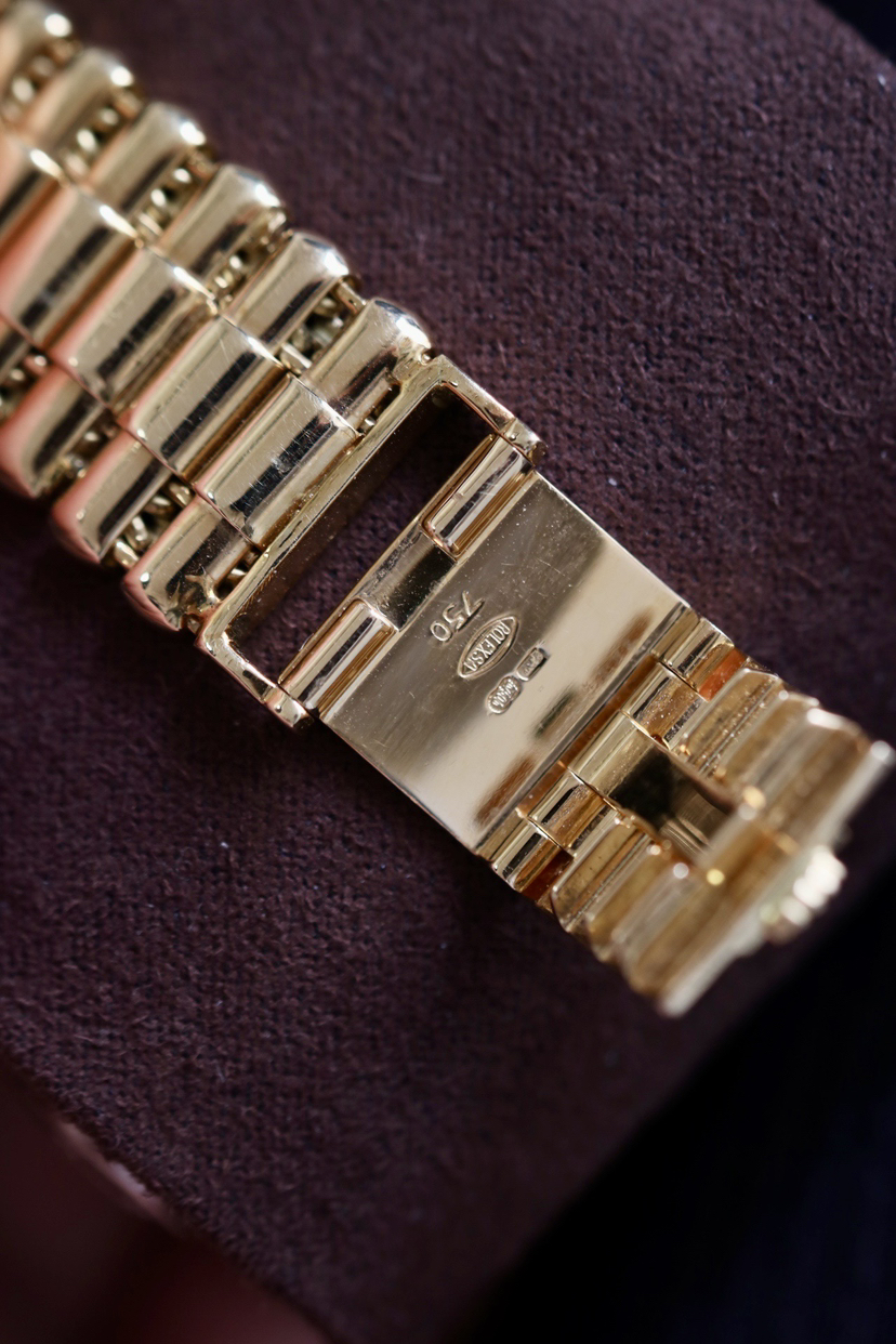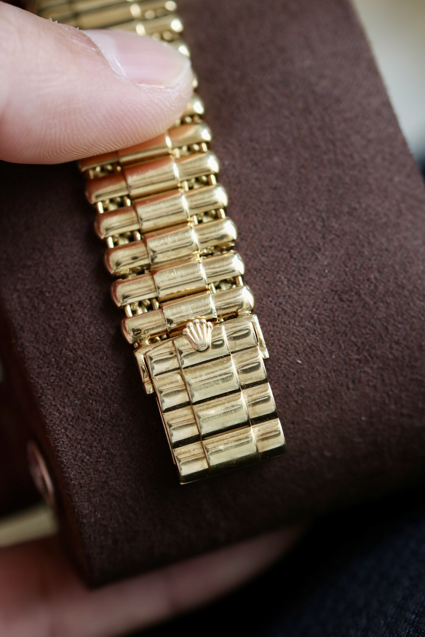 劳力士 5162切利尼 稀有的砖型链节(Brick-link)/ 一体式伸缩链节(也被称为「纪念型变体」「切利尼专属金带」)链节为多层矩形结构,上下层链节交错连接,中间以黄金铆钉固定,形成流畅的弧形贴合手腕。