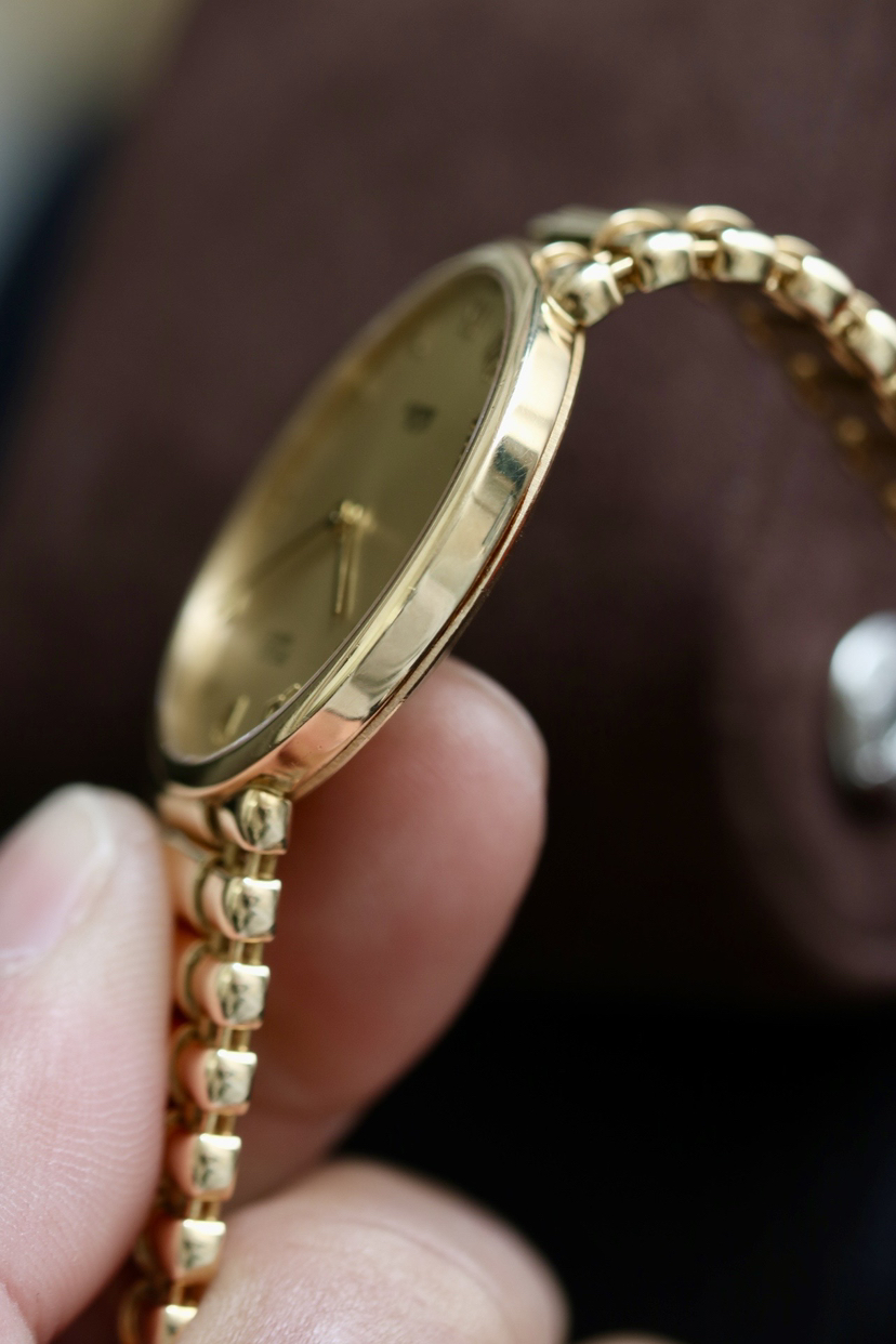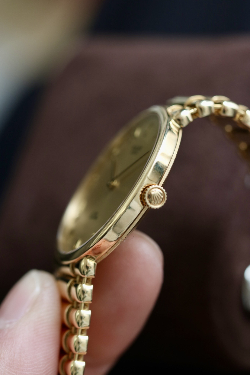 18K黄金材质,经典圆形表壳,直径约32mm(复古正装表经典尺寸),手动机械机芯 原始品相无打磨翻新