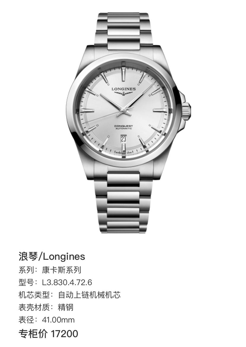 浪琴/Longines 康卡斯系列 L3.830.4.72.6 自动上链机械机芯 精钢 41.00mm 专柜价17200