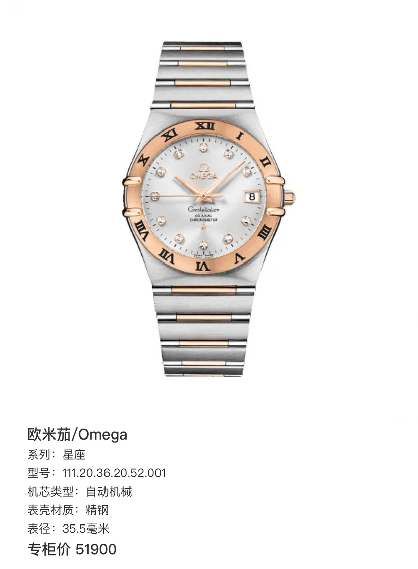 欧米茄/Omega 星座 111.20.36.20.52.001 自动机械 精钢 35.5毫米 专柜价51900