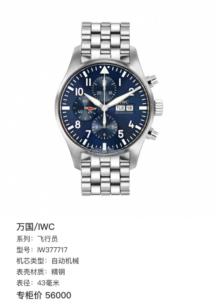 万国/IWC 飞行员 IW377717 自动机械 精钢 43毫米 专柜价56000