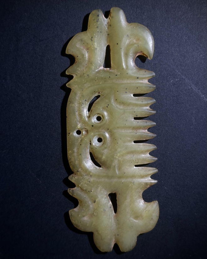红山文化河磨玉勾云佩,玉质凝润如脂,通体打磨光洁。勾云纹婉转流动,雕琢古拙有力,原始巫神之气扑面而来。土沁斑驳自然,包浆浑厚,形制完整,尽显史前玉器神秘苍茫之美。