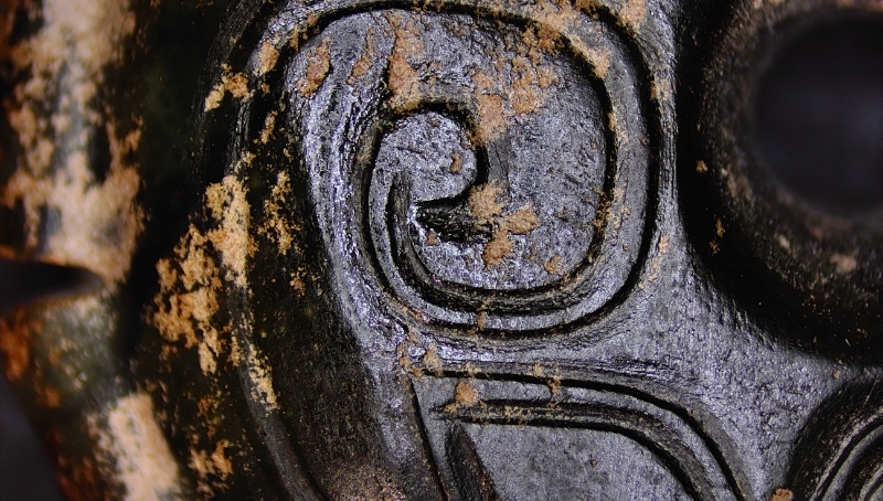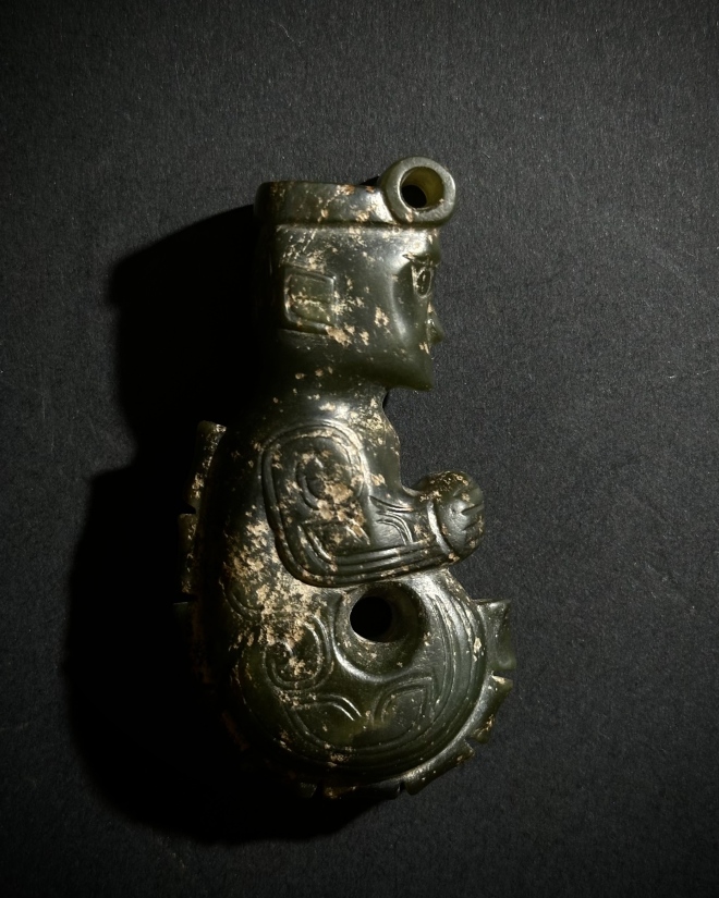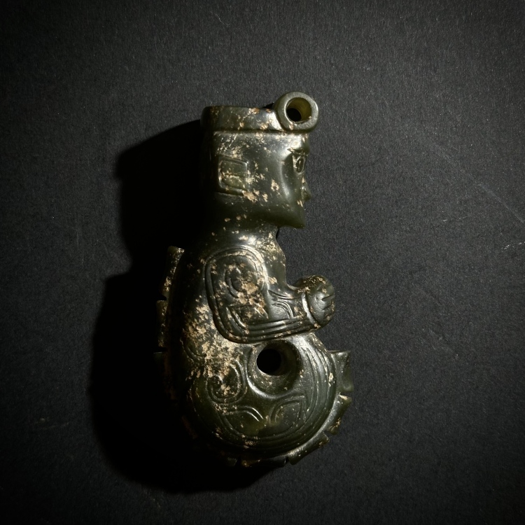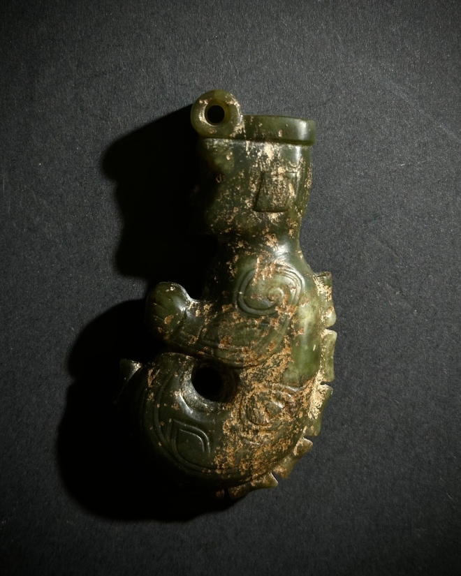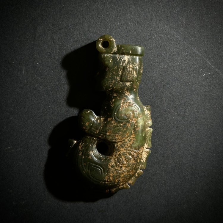 商周和田玉龙形挂件,玉质温润,龙身蜿蜒矫健,双目炯炯有神,刀工精湛传神。通体老沁自然,包浆醇厚,形制精巧适佩,尽显上古王玉之威仪。
