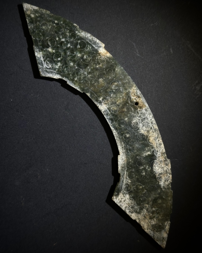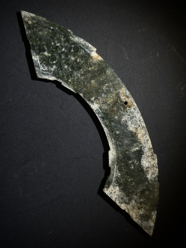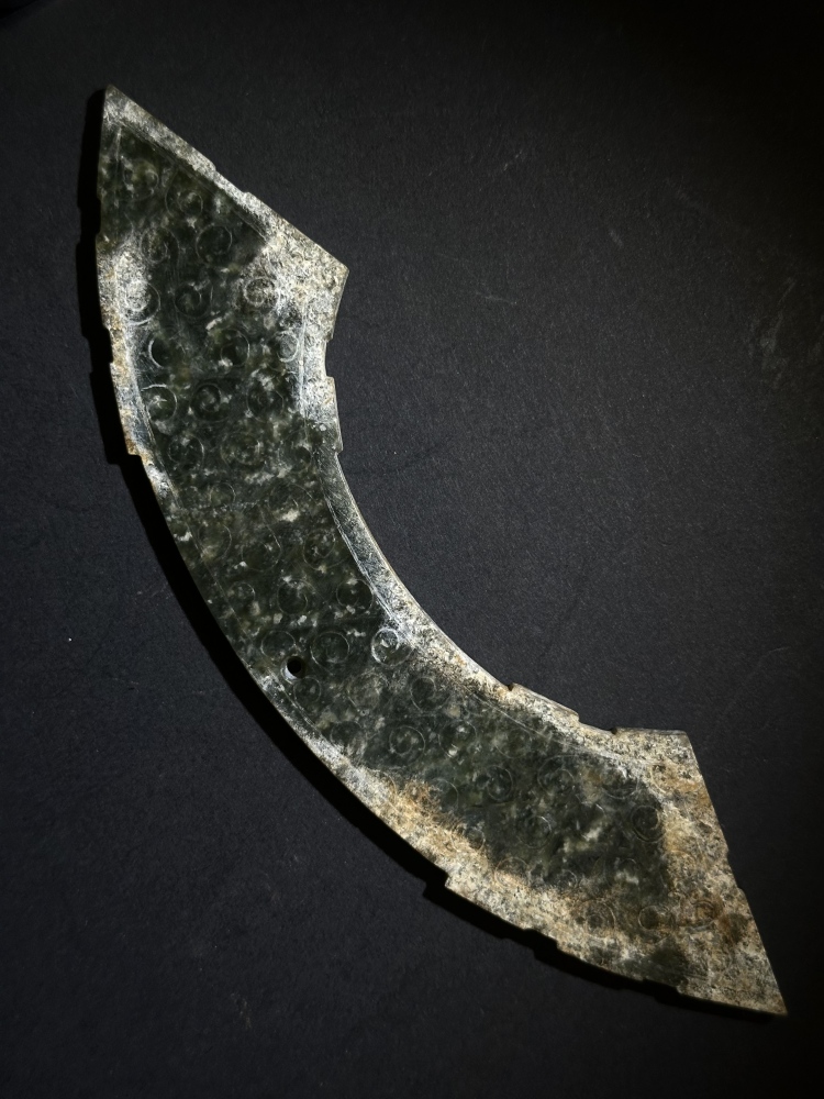 战国和田青玉谷纹璜,玉质莹润细腻,光泽内敛,通体满工浮雕谷纹,排列规整,疏密有致。包浆醇厚自然,沁色古朴,雕工精湛,线条流畅有力,尽显战国玉器之高华气韵。