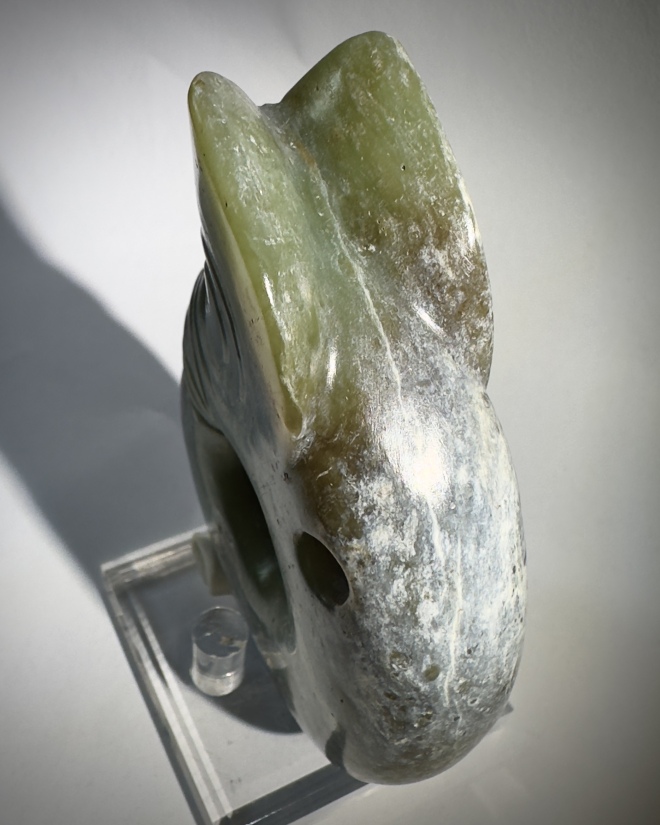红山文化河磨玉猪龙,玉质温润油亮,光泽内敛。造型浑厚古朴,龙首猪身,线条简练有力,穿孔圆润规整。周身包浆醇厚,沁色自然,尽显史前文明的神秘与粗犷。