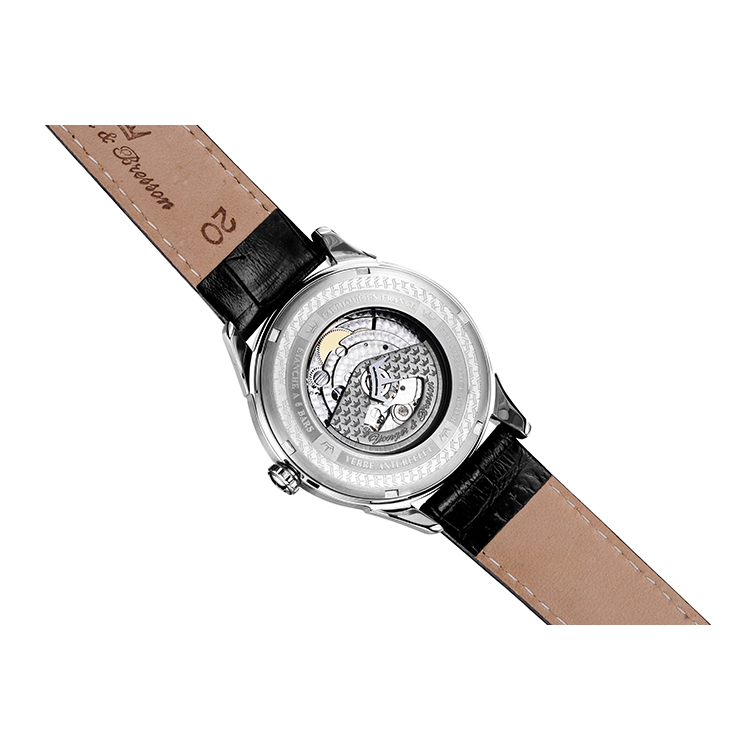 透过表底可欣赏精细打磨的手表机芯,飞速转动的摆轮游丝、晃动不停的自动陀,外圈由品牌logo组成的波浪纹与自动陀相映更显精致